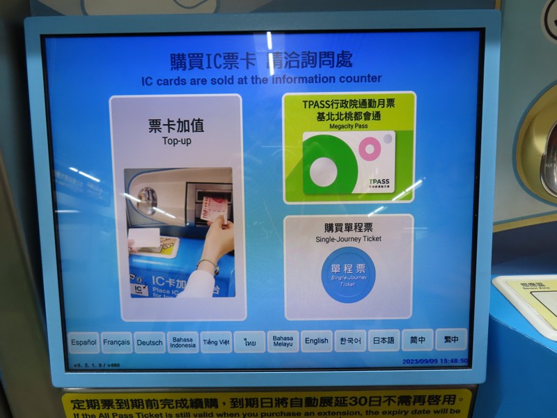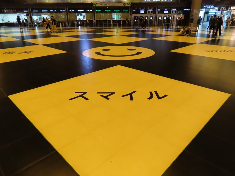フードコートはまだまだにぎわっている。また機会があれば、他のお店にも来てみましょう。台北駅大ホールの床にはいろんな言語での「スマイル」が描かれていました。ホテルに戻る前に、明日の朝ごはん用におにぎりなど買いましょう。台湾らしく、雞肉飯でね(110)。