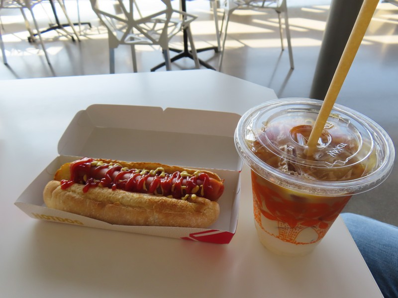 セキュリティチェックを過ぎ、次は出国審査だがエスカレーターを下りてこれまでとは逆の方向に進む。あれ、どこに行く?自動の出国審査を過ぎ、そのまま進むとさらにエスカレーターを下りる。すると免税店が広がり、ショップやレストランなどがある場所。ここ、以前の国内線到着エリアあたりでは。関空に到着してから出国フロアまでの道も以前あった中央エスカレーターがなくなったと思っていたら、かなり大がかりなリニューアル。でも確かに出国手続き後のエリアはこのくらい広い方がいいな。出発ゲートまでは距離があるのでシャトルに乗るために3階へと上がる。すると以前は免税店など並んでいたエリアが完全に封鎖され、シャトルへの通路があるのみ。今は3階のリニューアルが行われているようだ。次関空に来る頃には、また違う姿を見ることになるのかな。とりあえず、朝ごはんにしよう。シャトル中間駅を降りた近くにあったプロントで、ホットドッグとカフェオレ。マスタードとケチャップをたっぷりつけて、いい感じの朝ごはん。