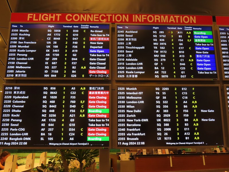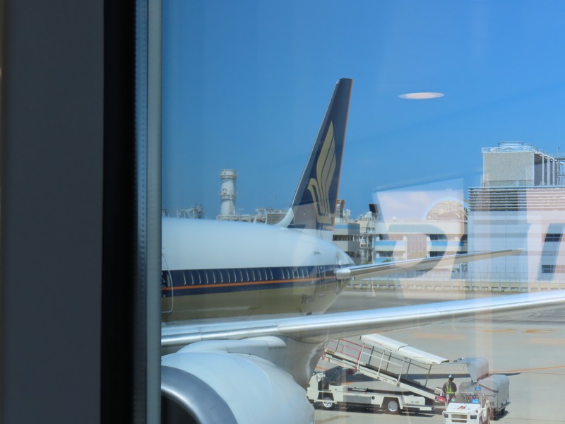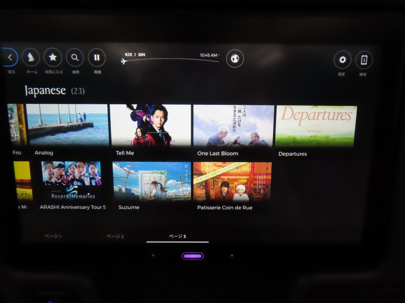 10時半前になり、搭乗開始。ゲートに着いたのがちょうどビジネスクラスの案内が終わったタイミングで、ほぼ一番乗りで機内へ。 久しぶりのシンガポール航空だ。3-3-3の配列なので真ん中の3列通路側から2席。なので外の景色を楽しむ感じではないが、まあよい。パーソナルモニタも大きいし、映画や音楽などゆっくり楽しみましょう。