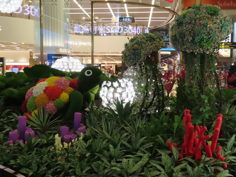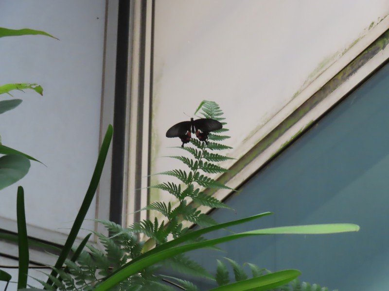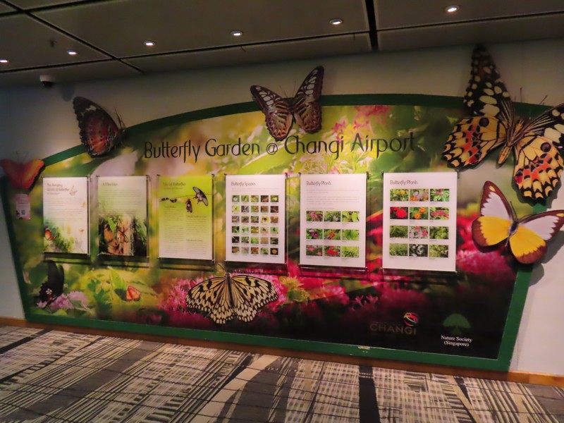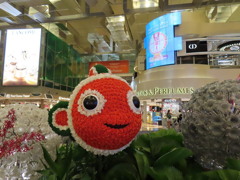 ラウンジを出ると、すぐ隣にあるのがバタフライガーデン。チャンギはこうした無料で楽しめるアトラクションがいくつかあるのだ。もわっとした中でたくさんの蝶が飛んでいるがちょっと遠くてよくわからない。一匹だけ、葉に止まっていたので写真が撮れました。さて、まだまだ時間はあるしおなかもいっぱいなので、しばらくは空港内のお店をぶらぶらと見て回る。