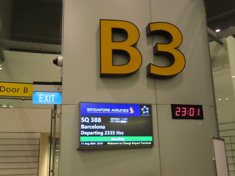 ゲート近くのカフェ前には大きなテレビがあり、そこではパリオリンピックの最後の試合、女子バスケのアメリカフランス戦が行われていました。バルセロナ行きの出発ロビーの前にはセキュリティゲートがあり、しばらくして手続き開始。そこで水を捨てられました。。これ、どうにかならないかなあ。シンガポールから出国する人はここまでセキュリティ通ってないってこと?そんなはずはないと思うのだが、このタイミングでのセキュリティでは水OKのところもあればNGのところもある。なのであまり水を買えないんだよね・・不便です。中に入ると給水機があり空っぽにされたボトルに入れられるが、それもちょっとなのでここで改めて水ゲット。まあ、シンガポールドルが10.8ドルあり水が2.9ドルだったので2本買ってちょうど残額5ドルになったので、小銭整理ができたということで。