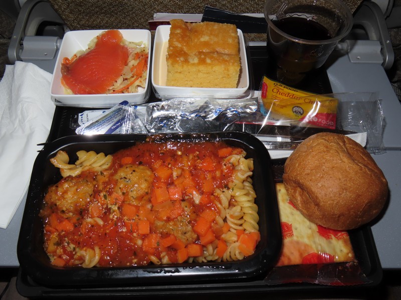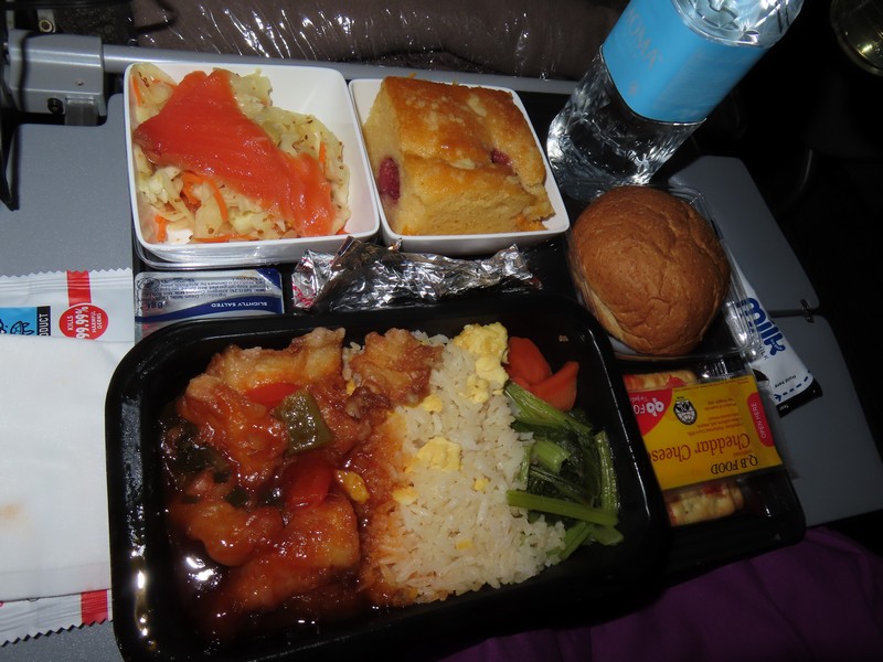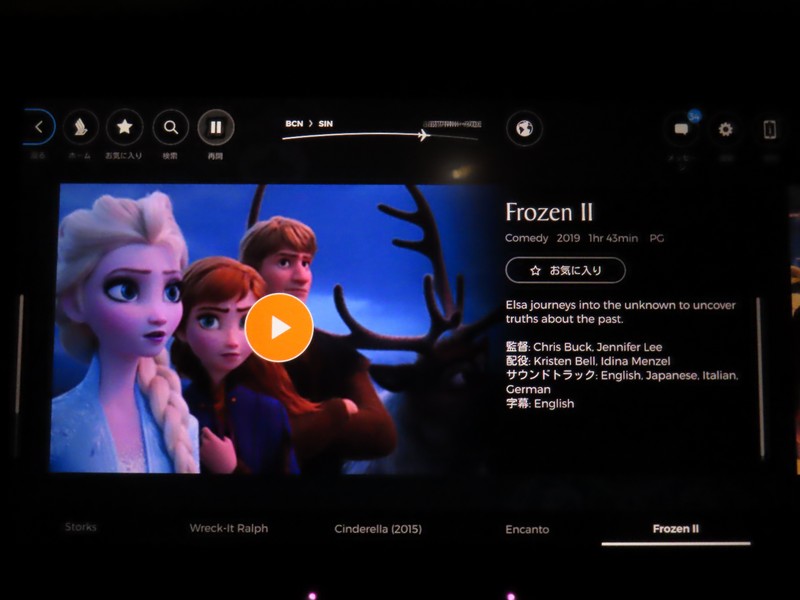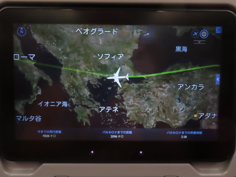 搭乗開始となった。今回も3-3-3の真ん中3列通路側から2席。でもこの便はそこまで満席でもなく、結局隣の席には誰も来ず。これはラッキーだ。もうかなり眠いが「アナ雪2」でも見ながらのんびりしよう。予定の出発時間を30分ほど遅れ、チャンギ国際空港を出発した。うーん、それにしてもアナ雪2はよくわからん。1とは世界観も違うし関連性もないな。まあいい、せっかくなので最後まで見ておこう。機内は暗くなっているが、出発から1時間ほど経った頃、機内食が始まった。日本時間的にはもう2時を過ぎたタイミングからの食事、さすがに眠いがチキンのミートボール入りパスタが意外とうまい。赤ワインとともにいただきます。もう一つは魚のチリソースのようなものとチャーハン。夜中にはちょっと重そうだが、さらっといただく。でもデザートのケーキはさすがに無理。バルセロナまでは13時間ほどかかるので、機内食もしっかり出るよね。とにかく眠いので、この後はなるべく寝ておこう。