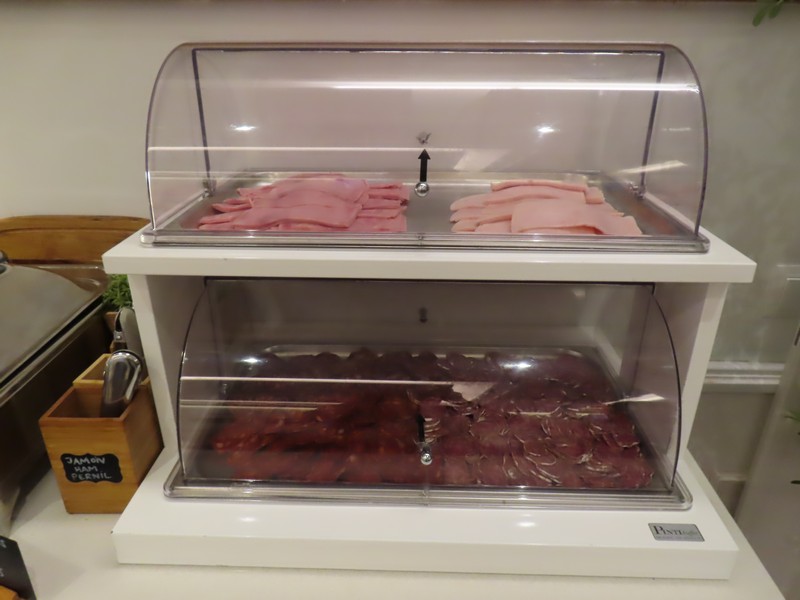4時ごろ目が覚めた。日本時間だと昼の11時だし、昨日も夕方からしっかり寝ているのでちょうどいい感じ。しばらくは日記書きなどしながら過ごしましょう。6時過ぎよりシャワーに入る。昨日からの長時間移動の疲れをようやく洗い流せるようで、とても気持ちいい。さっぱりしたところで、7時半ごろ朝ごはんへ。ホテル2階にあるレストランへ行くと、まだ一組しかいない。なのでまだきれいに並んでいる状態で、ハムやサラミ、ソーセージやチーズなどシンプルでおいしそう。パンのところにはトマトをつぶしたものがあり、これはパンコントマテ用だね。あとはオレンジジュースをいただき、スペイン感満載の朝ごはん。こういう感じ、いいね。卵料理や豆の煮込みなどもおいしいし、朝から進みます。今日はこのあといろいろ食べたいし、ここは4泊食べられるのでほどほどに。コーヒーと甘いパンで締め、ごちそうさまでした。 では準備をして出発だ。まだ10時だが、昨日に続いてボケリア市場へと行こう。