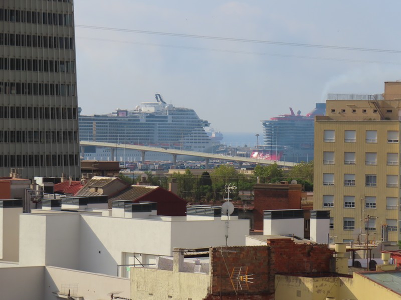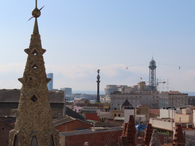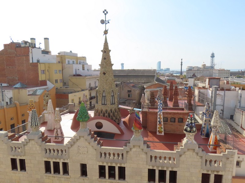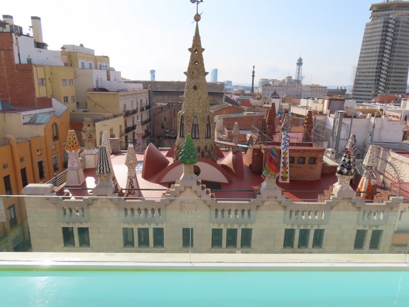 ホテルの屋上テラスに行ってみよう。Hotel Gaudiというだけあって、目の前にあるのがグエル邸。ガウディの重要なスポンサーであったグエルが実際に暮らしていたところだ。その屋上にある煙突には、サグラダファミリアやグエル公園でも見られる破砕タイルを使用したカラフルな装飾がされている。この景色が見られるのは宿泊者の特典だ。この屋上には小さなプールもあるので、水遊びしながらのグエル邸、なんて贅沢なこともできるわけで。遠くには停泊中の豪華客船が見えているし、モンジュイックの丘とバルセロネータをつなぐロープウェイも見える。滞在中に、その辺りにも行ってみたいな。