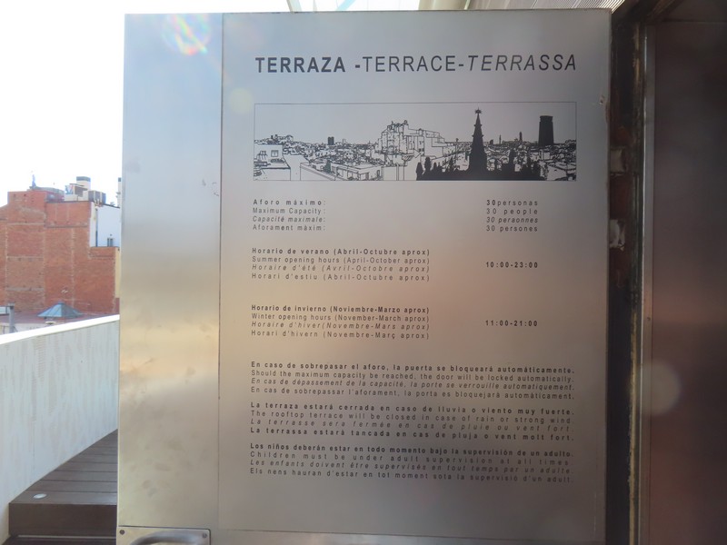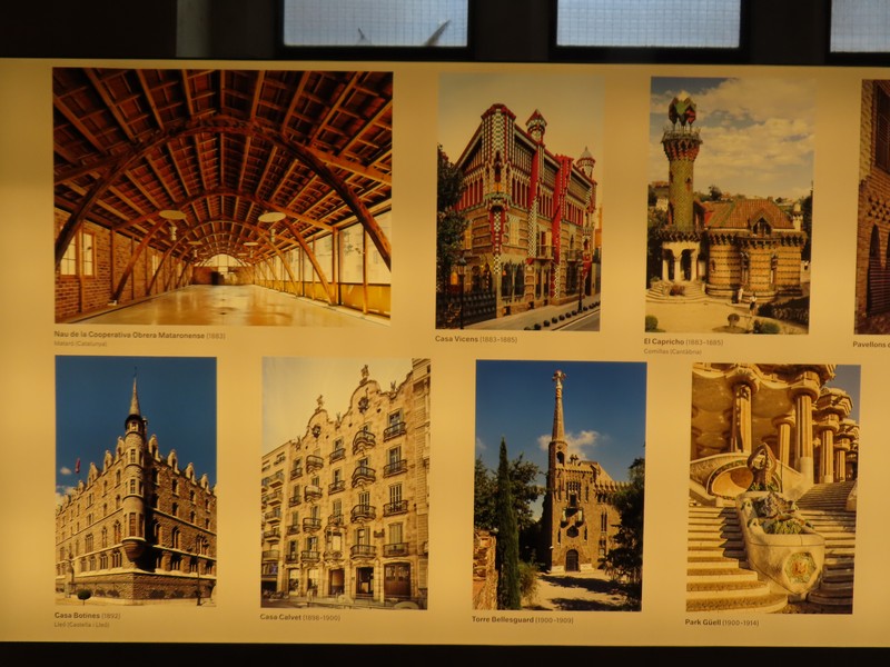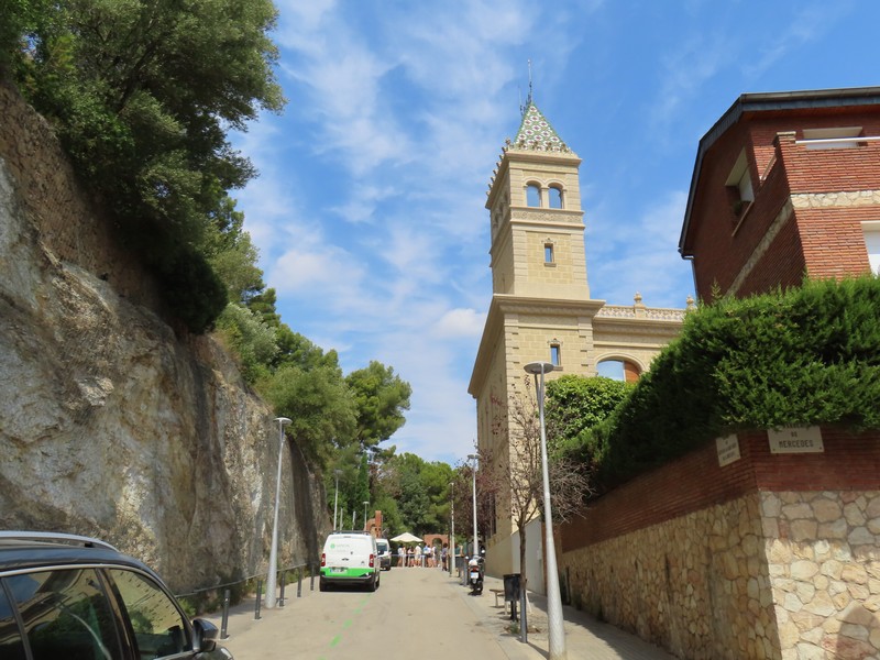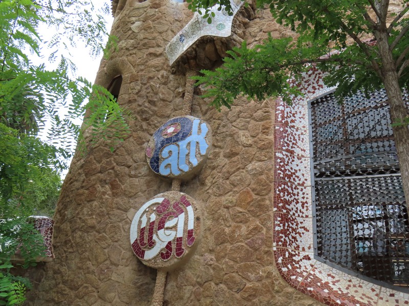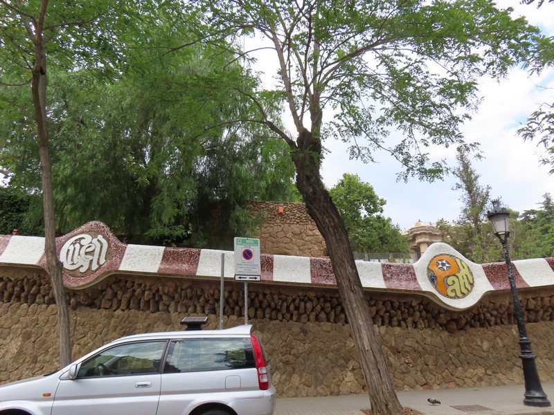 正門にあるのが守衛小屋と管理小屋。どちらもお菓子の家のような建物で、明確に敷地を強調するためにこのようなデザインになっているようだ。テラスから見て左側の守衛小屋は、現在はバルセロナ市の歴史博物館となっていて、少し並んで中に入る。展示や映像などを見るのもいいが、2階や3階の窓から大階段あたりの景色を見るのもいい。さて、これで一通り見たかな。正門を出て、しばらく公園の壁沿いに歩く。外側にもいくつかモザイクがあり、ParkやGuellの文字がデザインされている。同じデザインのものはないんだろうな。