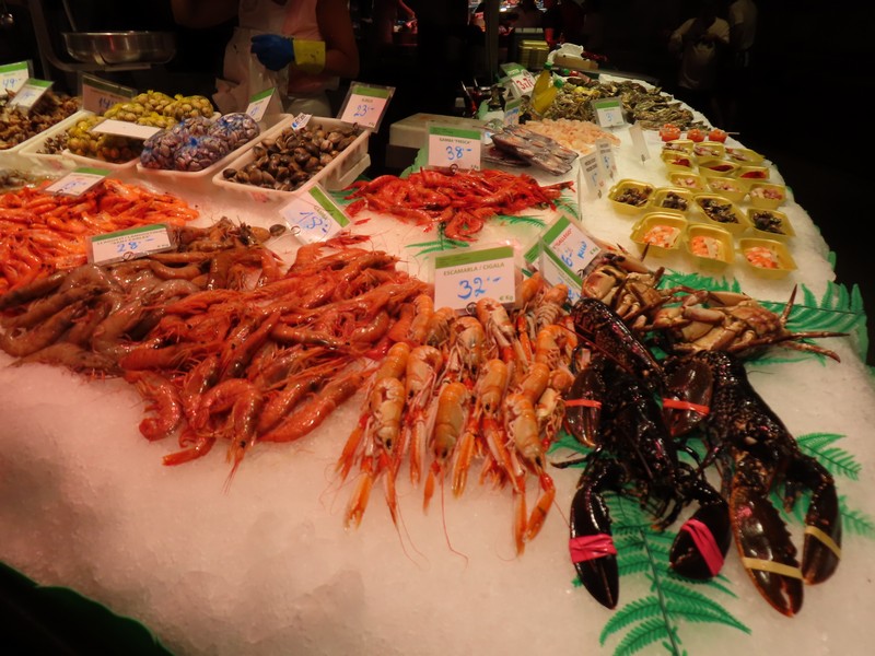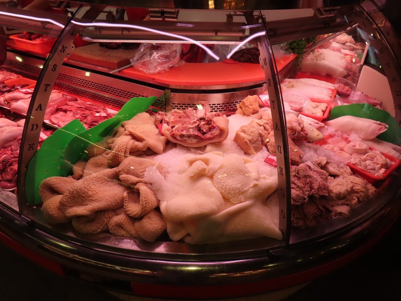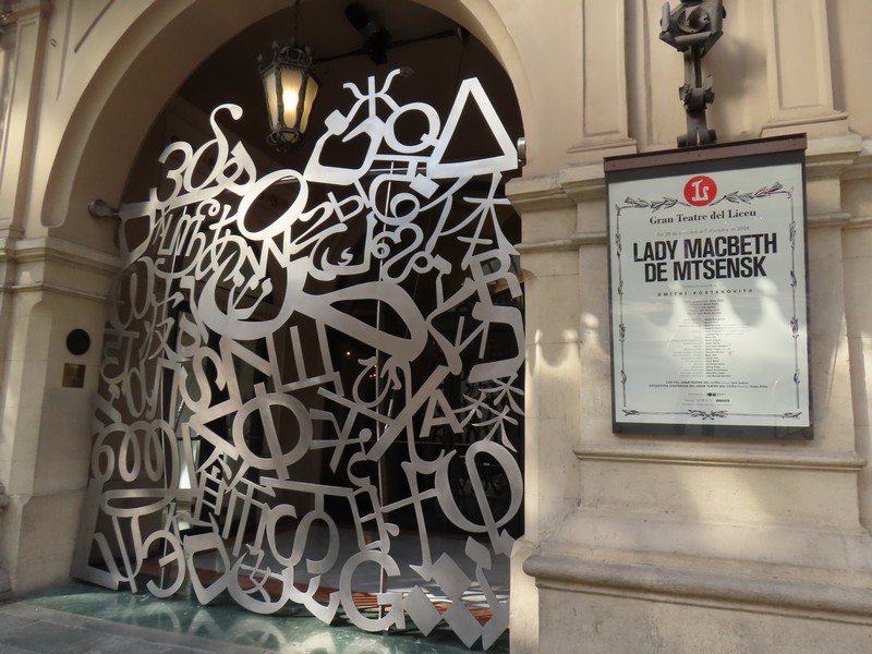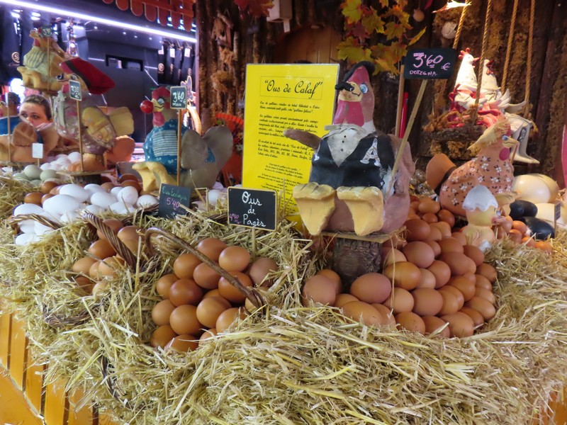 では出かけますか。昨日に続いて、まずはボケリア市場へ。途中にあったリセウ劇場は、その門のデザインが様々な言語の文字。よく見ると、アルファベットはもちろん漢字やひらがな、ロシア文字などもある不思議なデザイン。面白いな。そのすぐ近くがボケリア市場、ここはいつも通りににぎわっている。進む道を少し変えてみると昨日見なかったお店があったり見える方向が変わったりで新鮮な感じ。ホルモンのいろんな部位を売っている店があり、なんとも興味深い。新鮮なエビが並ぶお店もおいしそうだし、生みたて卵を売るお店もあるんだね。