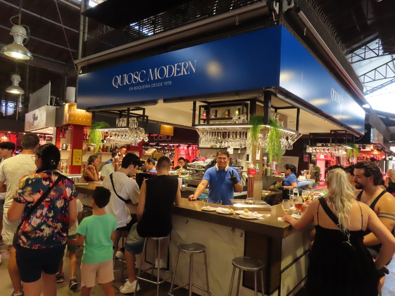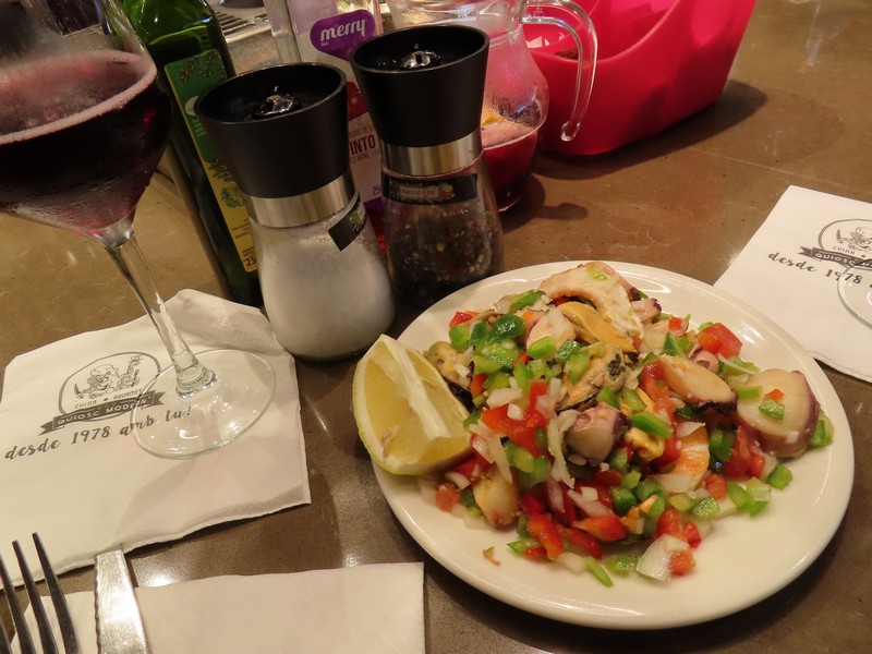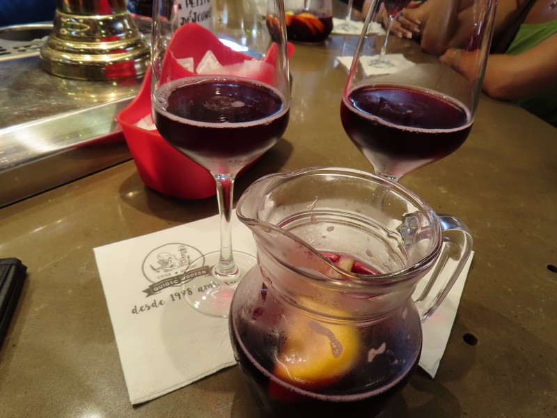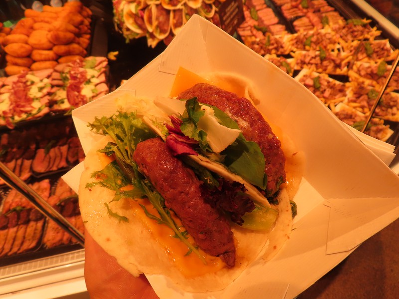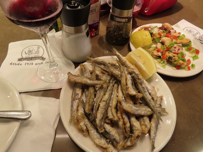 いろいろ見ていると、タコスを発見。ハンバーガーのパテのようなのが入っていて、いただきましょう。野菜もチーズも入っていてまさにチーズバーガーで、スパイスが効いているのがいい感じ(6E)。お腹もそんなにすいているわけではないのだが、ふと席の空いているバルを発見。どんなものがあるかとメニューを見ているとそのまま席に着くことに。まあ、仕方ないですね。ここはまずサングリア。ほんのり甘みがあり、さわやかさが夏にぴったり。ここではシーフードサラダとアンチョビフライをいただきましょう。タコ・エビ・ムール貝とパプリカなどの野菜がたっぷり入ったサラダ、これをオリーブオイルとバルサミコでいただきます。さわやかで、サングリアも進みます。しばらくしてアンチョビフライが出てきた。要するにイワシのフライ、レモンと塩でシンプルにいただきます。ほくほくしてとてもおいしいが、量が多い・・本当は他にイカフライとかも食べたいが、さすがにこの量食べると満腹です。ハーフサイズやミックスがあればいいのにな・・でもおいしかったです。ごちそうさまでした(32E)。