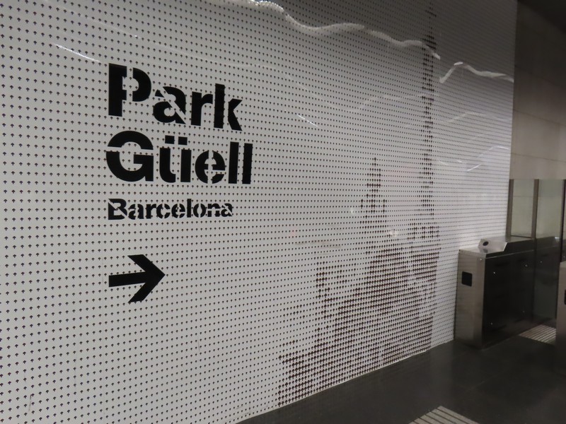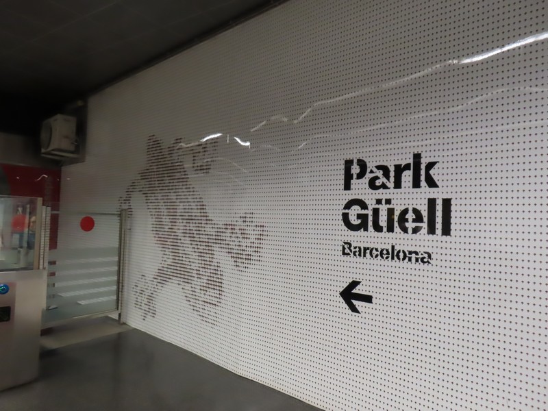 では行きますか。カタルーニャ広場から地下鉄に乗る。切符は一律料金で、一人2.55e。円にすると結構高いもので。緑のL3線に乗り、レセップス駅まで。ここはグエル公園の最寄り駅なので降りる人も多い。改札の壁には、グエル公園をイメージしたモザイク画がありました。駅を出ると小さな公園があり、ここから歩いて15分ほどとのこと。1996年にも来たはずだが、あんまり覚えてないなあ。暑いので、途中のスーパーとかに寄り道しながらゆっくり行こう。