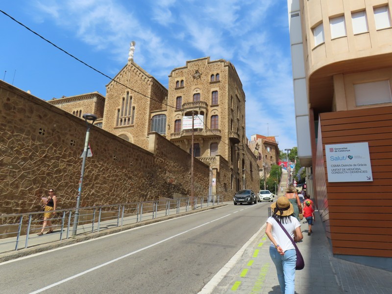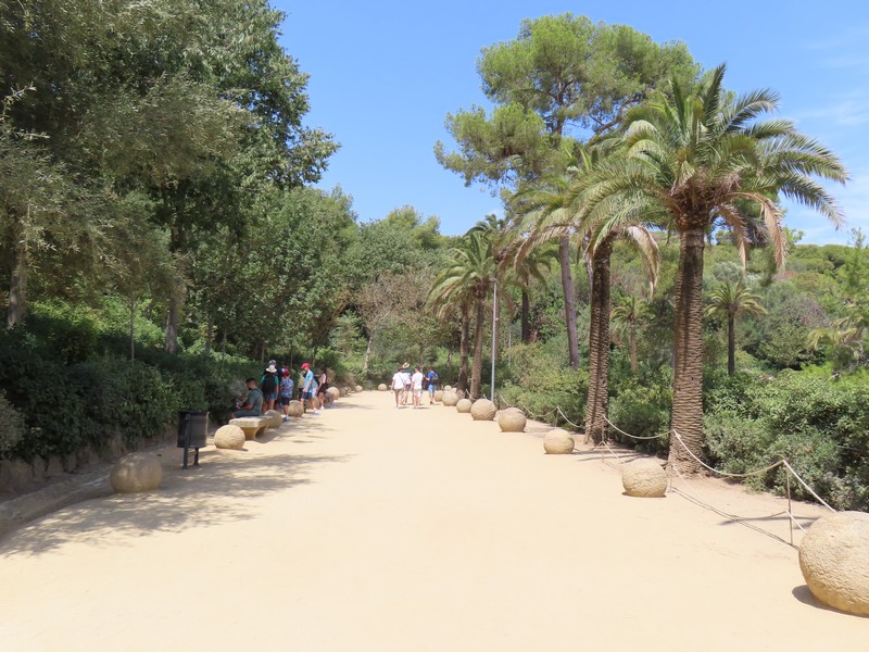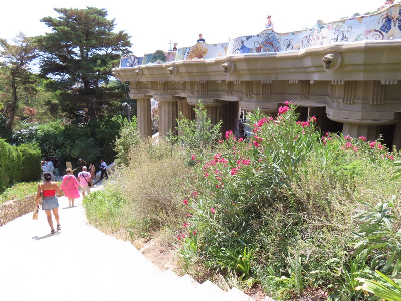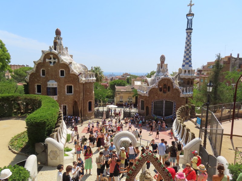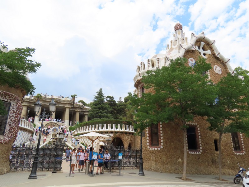 グエル公園への道は、途中から坂道になる。このあたりはなんとなく記憶にあるかも。階段横のエスカレーターもありがたく使いながら登っていく。教会があったり壁の落書きがあったりと景色も楽しめるがとにかく暑い。坂を登りきるとようやくグエル公園の入口に到着。以前はここで並んで入ったのだろうが、今は事前予約制。当日券もあるが、どうやら今日はすべてSOLID OUT。13時からの予約なので15分ほど、なんとか影に入って待つ。5分ほど前になり、入り始める人が出てきたのでもういいのかな。チケットを見せたら、無事に入ることができました(@13E)。