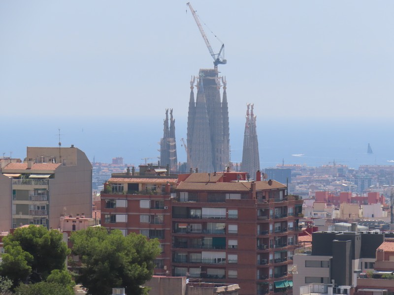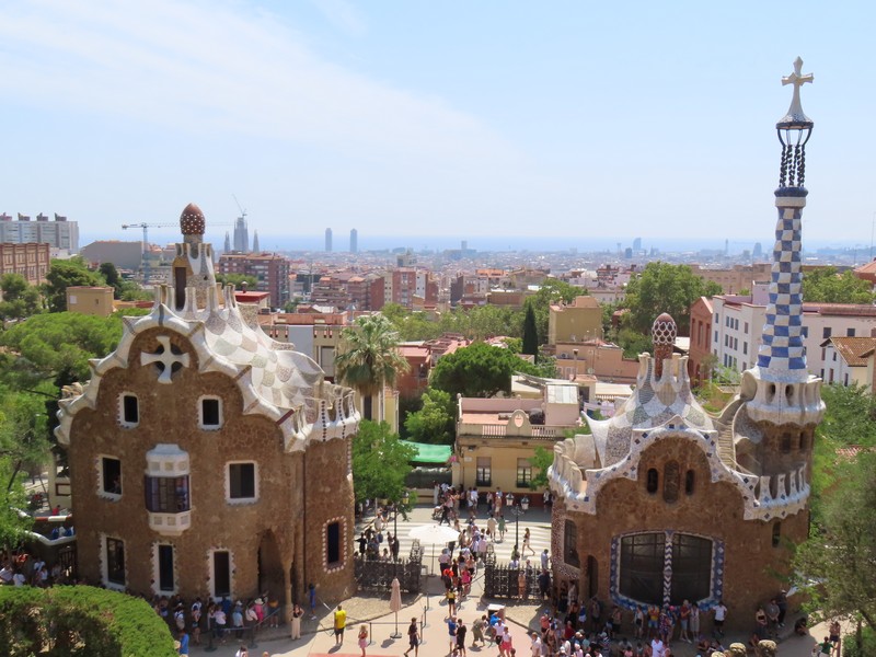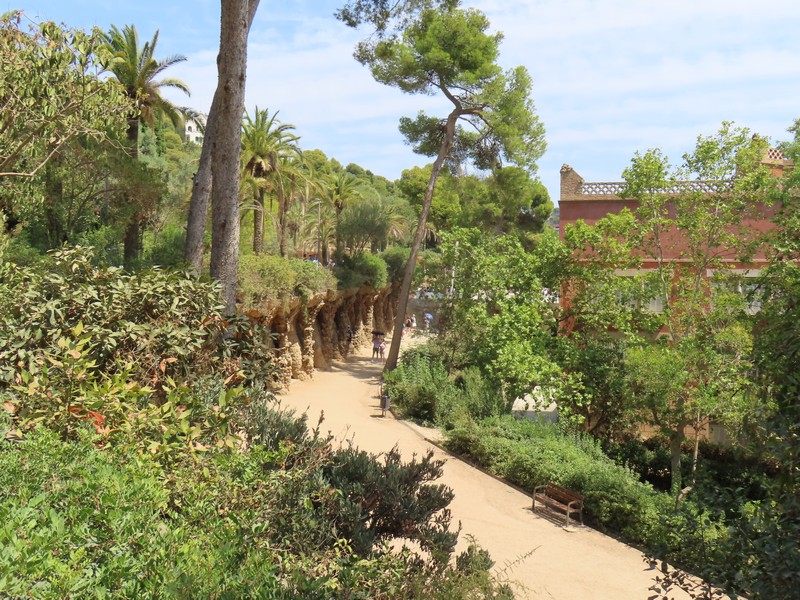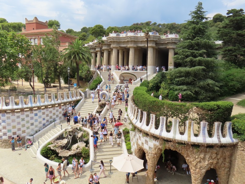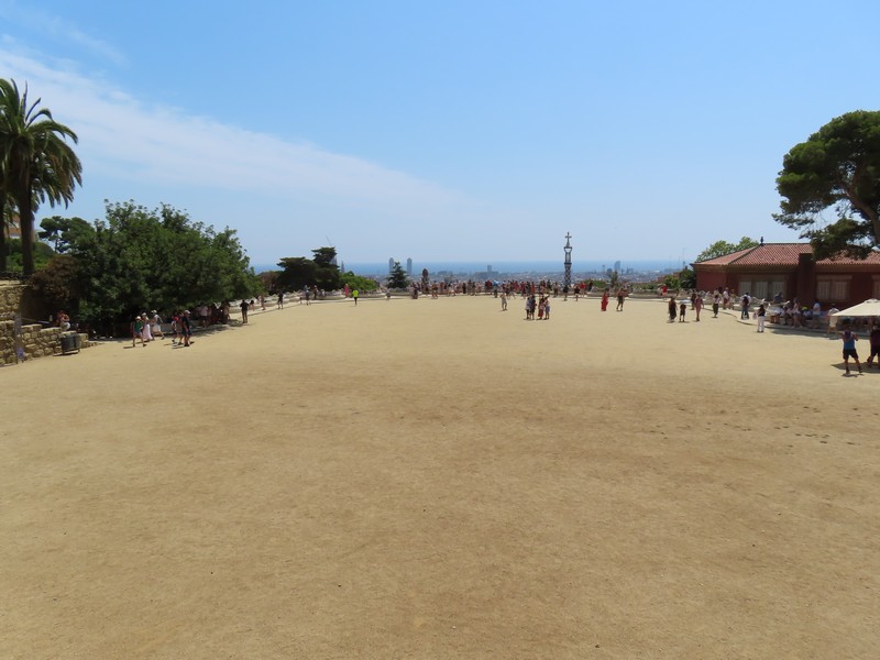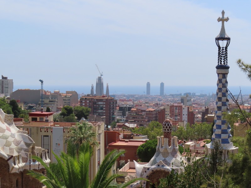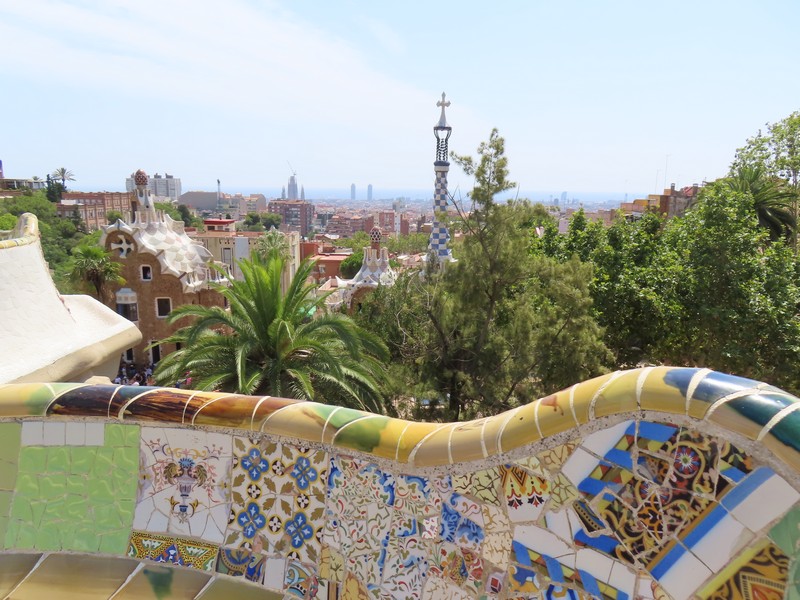 ヤシの木が並ぶ道を進む。ここグエル公園は、グエルが街を見下ろす山の手の土地にイギリス風の住宅街を作ろうとしたことからガウディによって整備された。広い場所に出てきたが、ここは中央テラス。別名をギリシア劇場という共用スペースで、破砕タイルにより装飾されたベンチが周りを取り囲むようにある。この波打つ形は、ガウディが人体の形からイメージしてデザインしたとのこと。ここからはバルセロナの街が見下ろせ、サグラダファミリアとその向こうに広がる地中海、これは絶景ですね。今は建築中だが、サグラダファミリアの完成時にはまた違った景色になるんだろうな。