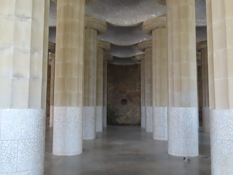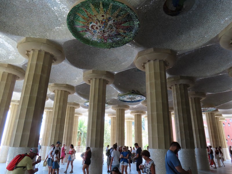 下に降りると、そこは列柱ホール。市場になる予定の場所だったらしい。まるでギリシアの神殿のような柱が並んでいて、中央テラスを支えている。その天井には太陽や月をイメージしたモザイクがあり、これはガウディの弟子にあたるジュジョールの作品。さらにこの地下には、雨水をためるための貯水槽が作られているらしい。結果的に住宅街としては失敗したようだが、こうして公園という形で現代に残り、人々を集める場所になっているのだ。