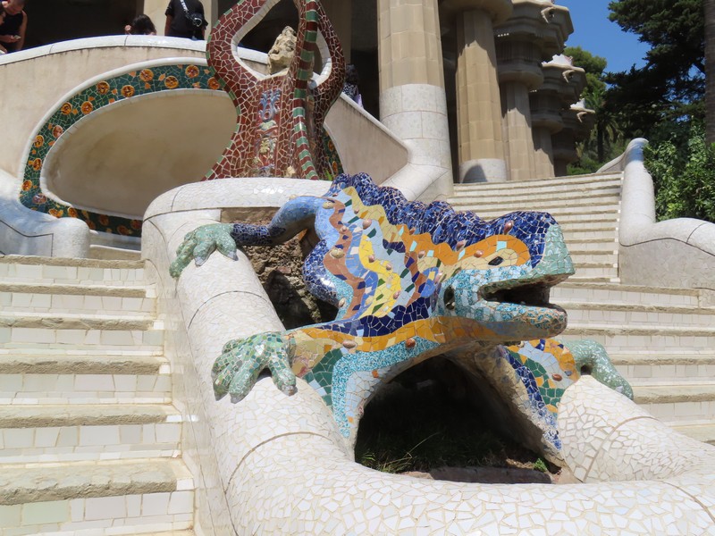 中央の大階段を下りる。この途中にあるのが、グエル公園のシンボル的存在のトカゲ。実はドラゴンやオオサンショウウオという説もあるが、それはさておきこの口を開けた表情がなんともユニークだ。人気の場所なのでみんな写真を撮るので、タイミングを見ていい感じに撮れました。このトカゲ、市場下の貯水槽の水を排出するという役割を持っているらしい。単なる飾りかと思っていたら、そんな重要な役割持っていました。そのトカゲより下のところにいるのが蛇のモザイク、ギリシャ神話で預言者モーゼを守ったネフシュタンとのこと。うーん、知らないことがいろいろありますね。