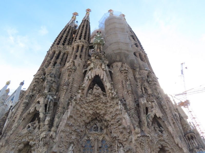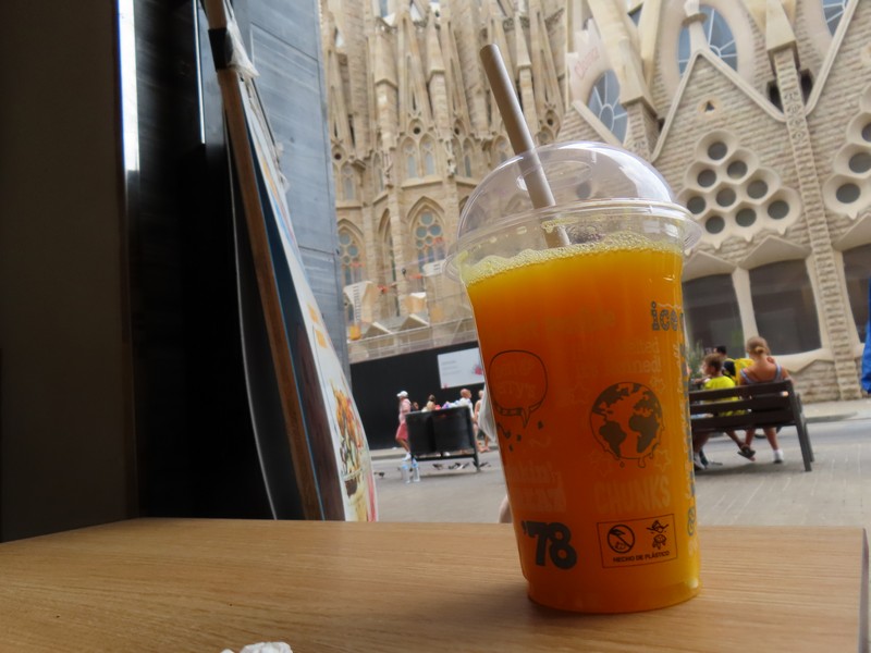 レセップス駅に戻り、ディアゴナル駅で乗り換えてサグラダファミリア駅へ。地上へ出ると、そこにはサグラダファミリアが高くそびえ立っていた。このスケールには毎回圧倒されるが、10年前に来たときよりも明らかに完成に近づいている。まず目につくのがベツレヘムの星を頂華にもつ聖母マリアの塔。2021年に完成したらしい。そして中央にそびえるイエスの塔、こちらは2026年の完成予定だが明らかに前回よりも高くなっている。そしてその周りにそびえる福音史家の4本の塔。聖マルコ(Mc・獅子)と聖ルカ(Lc・牛)は2022年、聖ヨハネ(Jn・鷲)と聖マタイ(Mt・天使)が2023年完成と、コロナ禍もあったが確実に進んでいるようだ。2年後の完成が楽しみです。入場の予約が15:45でまだ少し時間があるので、すぐ近くのカフェでサグラダファミリアを見上げながらオレンジジュースをいただきましょう(4.9E)。