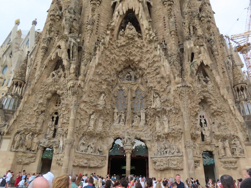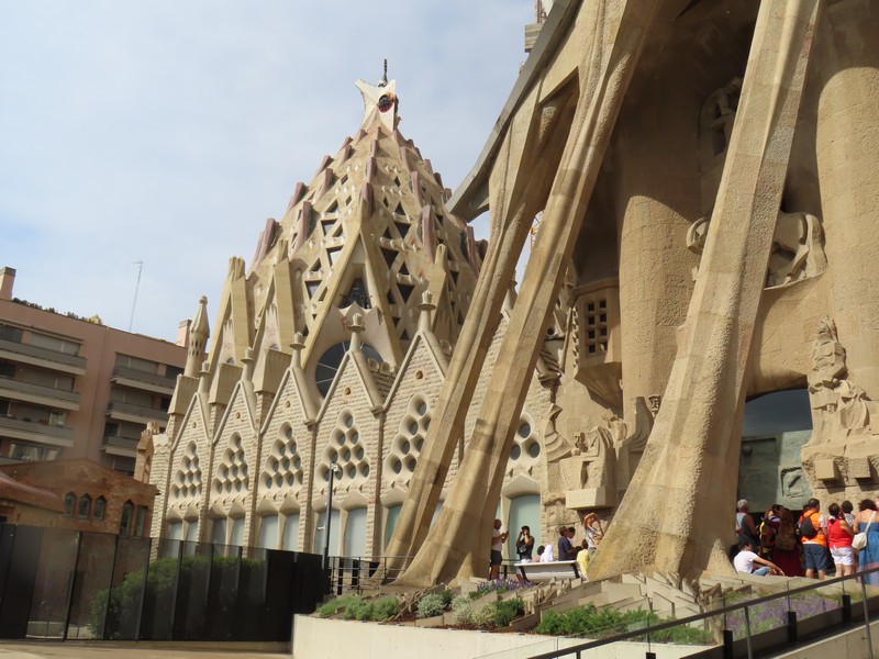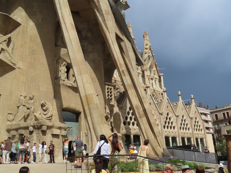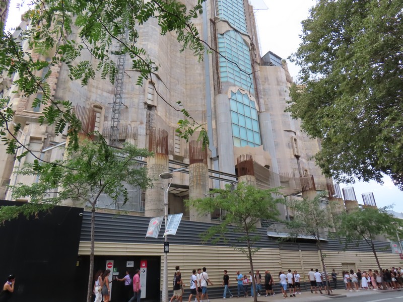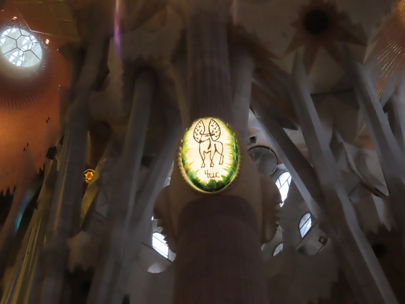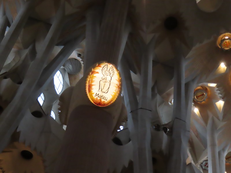 主祭壇近くの柱には、その上部に4聖人のシンボルがかたどられている。受難ファサード側の主祭壇に遠い方から聖マタイ(Mt・天使・オレンジ)と聖マルコ(Mc・獅子・赤)、生誕ファサード側が同じく主祭壇に遠い方から聖ヨハネ(Jn・鷲・青)と聖ルカ(Lc・牛・緑)。柱や天井の細かいところまで、聖書に基づいた精巧な装飾が施されているということ。 さて、そろそろ16:30、塔に登る予約の時間。10年前は生誕のファサード側を登ったので、今回は受難のファサード側。エレベーター前に行くと、何や様子が変だ。なんとちょうど10分くらい前から雨が激しく降っていて、この時間から後は天候不順にっより登れないとのこと。なんということ、タイミング悪すぎ。せっかく予約して来たのに・・あと一つ早い時間なら登れたわけだがどうしようもないし、その差額分は後日カードに返金されるのだが、これはなんとも残念。雨はすぐに小降りになったのだが、もう今日はダメなのかなあ・・・とりあえず、受難のファサード側を見よう。