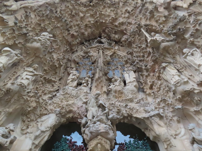 まずは生誕のファサード。唯一、ガウディの生存中に完成している。イエス誕生の喜びを表したもので、イエスの幼少期のできごとが表現されている。先端にあるのが「生命の水」、腐敗しないものの象徴であるイトスギと、神のもとに集まるハトなどが表現されている。そこから左側に「マリアとヨセフの婚姻」「嬰児虐待」「エジプトへの逃避」「東方三博士の礼拝」と続き、再度上から「聖母マリアの戴冠」「受胎告知」「天使の合唱隊」で中央を下りる。そして右側「羊飼いの礼拝」「働くイエス」とつながっている。また、三つの入口は左から「希望の門」「愛徳の門」「信仰の門」で、各門には生命力みなぎる植物や昆虫が彫刻されており、これらは日本人彫刻家の外尾悦郎氏がかかわっているとのこと。外尾氏は他にも天使の合唱隊など、多くの彫刻にかかわっているらしい。