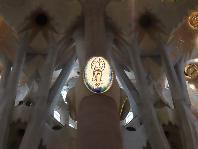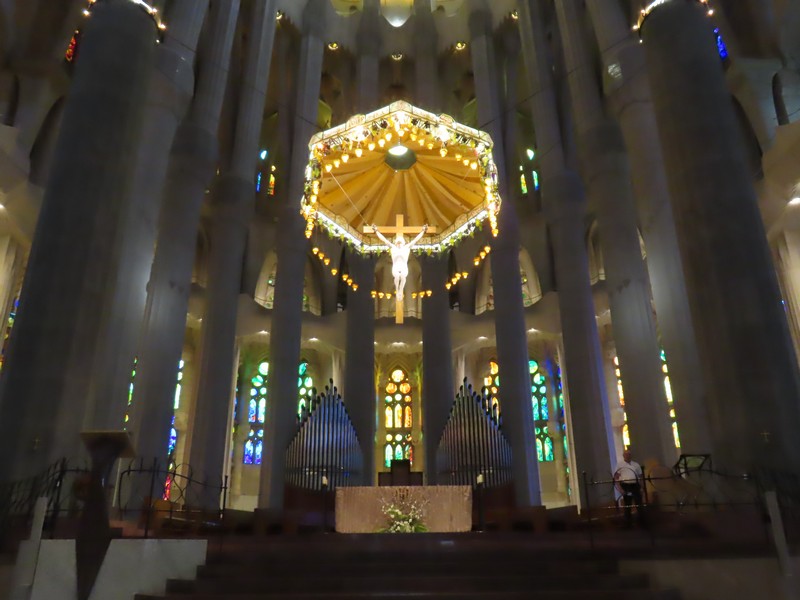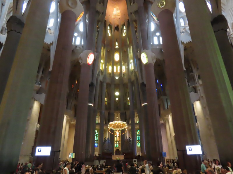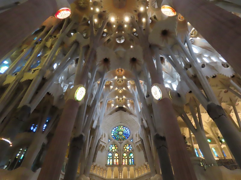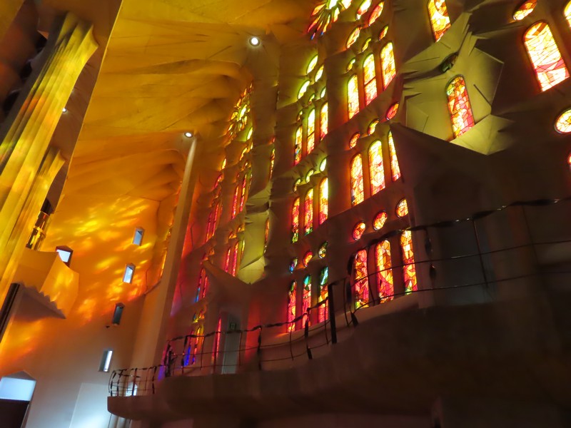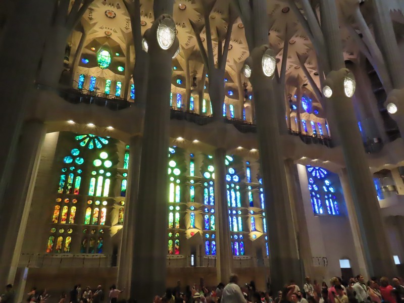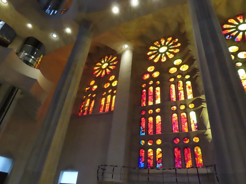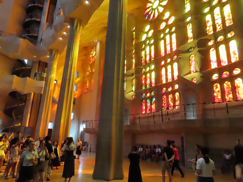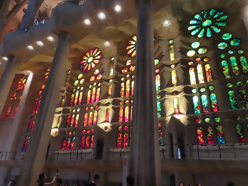 生誕のファサード側から聖堂内に入る。反対側の受難のファサード側の上部にあるステンドグラスが輝いて見える。午後の時間帯なので、日没している方向にある受難のファサード側に光が差しているのだ。聖堂の奥へと入り、そこから主祭壇の方を見る。たくさんの人が聖堂内のベンチに座り、祭壇側に向かっているようだ。聖堂は多数のステンドグラスで囲まれており、生誕のファサード側は青や緑が多く、受難のファサード側は赤やオレンジが多い。聖堂内にはたくさんの柱が立っており、ヤシの木がモチーフになっているとのこと。その柱が支える天井は波打つような装飾になっており、シュロの葉がモチーフになっている。たくさんの人がいて、みな思い思いにこの唯一無二の教会に見とれているようだ。反対側に行くと生誕側のファサード上部にあるステンドグラス、こちらは今は光が直接当たっていないので落ち着いて見える。