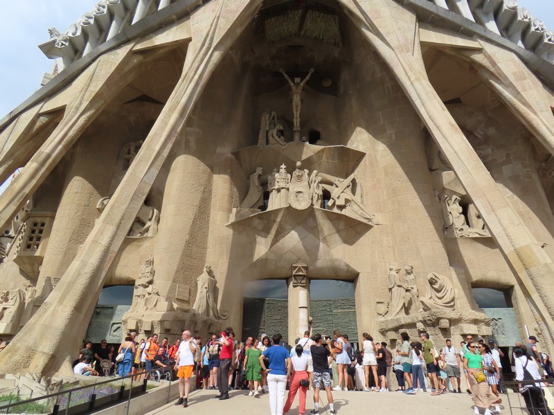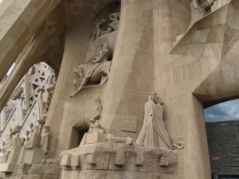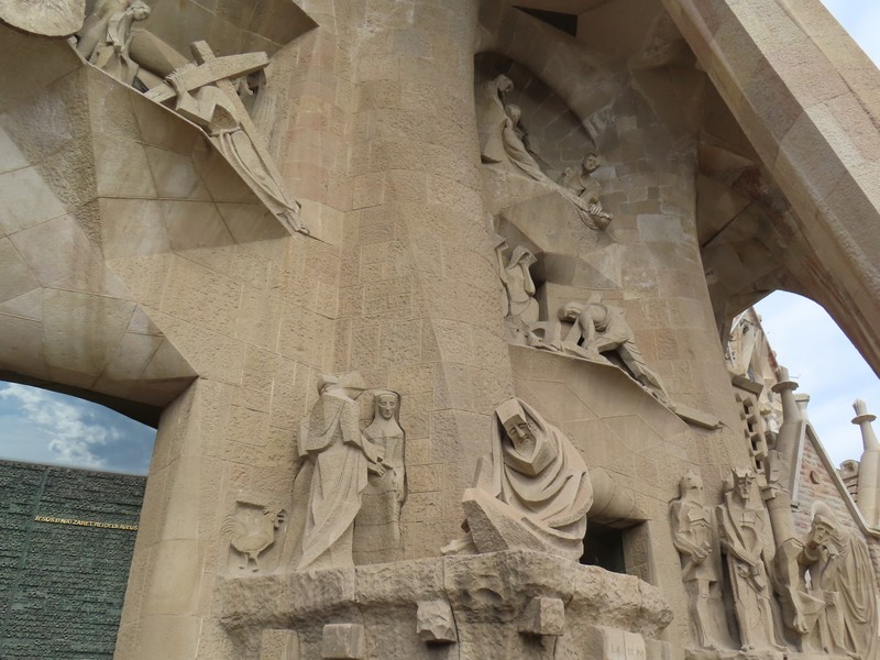 受難のファサードは、生誕のファサードの反対側にある。こちらは太陽が沈む西側にあり、イエスの死がテーマ。生誕に比べると装飾はなく、冷たい石の肌をあらわにすることで受難の苦しみを表現したとのこと。こちらは左の下から右に向かって磔刑前夜のできごとである「最後の晩餐」「ユダの接吻」門を挟んで「ペテロの否定」「イエスの裁判」。続いて左の上からゴルゴだの丘への道である「ロンギヌス」右に「3人のマリアとキレネのシモン」。そして中央上部の「キリストの磔刑」右にある「キリストの埋葬」と続いていく。中央の門には「福音の扉」があり、イエスの生涯最後の2日間について新約聖書からの抜粋が書かれているとのこと。