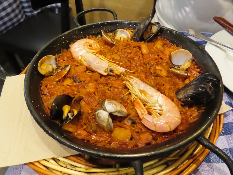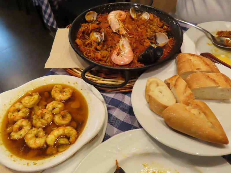 近くのスーパーに立ち寄った後、では夜ごはん。サグラダファミリアからほど近い、EL GLOPが目当てのレストラン。今が19時過ぎ、お店に入ると日本人や韓国人など、アジア系のお客さんが多い感じ。欧米人はもう少し遅い時間かな。席も空いていたし、ちょうどいい。まずはビールでのどを潤す。さて、ここの目的はエビのアヒージョ。しっかり大きめのエビが旨味たっぷりのオイルでアツアツになっている、これは、パンが必要ですね。エビをそのまま味わい、オイルをパンで味わい、どんどんすすみます。そしてここで食べたいのはフィデウア。パスタのパエリヤだ。昨日のお米のももちろんいいが、魚介の旨味をたっぷり吸いこんだ細いパスタというのも実にうまい。お米よりもさらっといただける感じで、こちらもどんどん進みます。とはいえしっかりパンの食べているのでこれでいい感じに満腹になるな。もっと他のものも食べたいところだが、こんなものかな。コーヒーとコルタードをいただき、ごちそうさまでした(50.85E)。