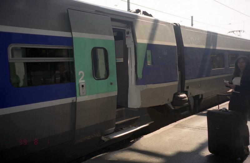 窓口で聞くと、乗ろうと思っていた10時28分のTGVは日曜日は運行していないということで、次のTGVは12時18分!3時間以上もある〜。でもやむおえまい。予約をし(40F)、カフェで時間をつぶしますか。こういう旅行をしていると、実は3時間待つくらいのことはなんてことない。キオスクでELLEを買い(30F)、GRAND CAFE DE CREMEを頼んでのんびりする(37.8F)。日記を書いたり、これからの旅程を調べたりしているとあっという間に11時30分になった。さてそろそろでようか。お昼ごはん用にハムマヨネーズとサラミのサンドイッチを買った。さてTGVに乗りましょう。チケットを見ると7号車だが、席の番号が入っていない。どこでもいいのかな?適当に座る。荷物をおいて落ち着いたので電車の写真をとりに行く。