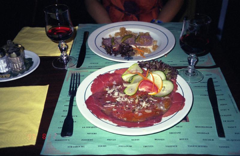 カジュアルなお店だ。前菜とメインのみでデザートを含まないコースがあったので、それにしましょう。チキンのテリーヌ+臓物ソーセージがさーちゃん、ビーフのカルパッチョ+鴨肉のペッパーソースがおれ。ワインは1998年のCOTE DE RHONE。若草の香りが感じられる若いワインだ。まず前菜が来た。やはりフランスの前菜はうまい。テリーヌはレバーの風味がする。つけあわせのコンソメゼリーと食べるとなおうまい。カルパッチョは牛肉が新鮮だ。薄く切ってあるが、ボリュームがある。