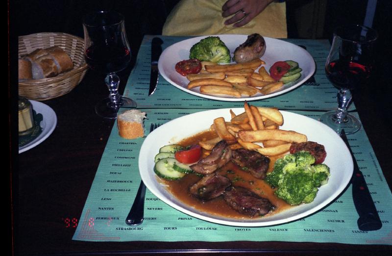 ぶらぶら歩きながらホテルに戻り、晩ごはんまでちょっと休憩・・・目がさめるともう9時、まだ時差ボケなもので。さあ、腹が減ったぞ。晩ごはんはホテルの近くにしましょう。何軒か見回って、ホテルの向かいのレストランに入る。