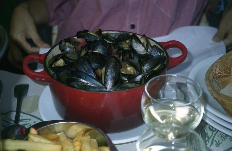 ここにくるといつも頼むプロバンス風と、初めてのマスタード風味を頼んだ。あとはビールと白ワイン。ロワールのミュスカデにしました。まずはビールでのどを潤し、そして久々の白ワインがうまい。しばらくして運ばれてきたものは、鍋いっぱいのムール貝。久しぶりだ〜。やはりフランスにきたらこれを食べないと。以前GWに食べたのよりも、ムール貝が大ぶりだ。時期的に育っているようだ。うまいうまい。初めて食べるマスタード風味もなかなかいける。スープにたっぷり浸しながらばくばく食べ、パンもスープに浸しながらばくばく食べ、あっという間に無くなってしまいました。ワインもおいしかった。満足です(267.4F)。