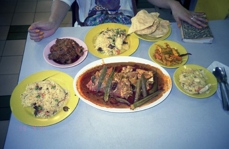 ビルを出てマレーシアの観光局で情報収集。さあて、明日からどうしようか。5/3に旧友とコタバルで待ち合わせをしているので行かなければならないし、イポーやペナンにも行きたいし、クアンタンやクアラトレンガヌという手もあるし、バスは時間がかかるしと悩んでいると、考えもしていなかった「飛行機」国内線が安いことに気が付いた。ペナン−コタバルがRM87、約2600円ではないか!よし、では明日はクアラルンプール→イポー→ペナンを列車で行き、明後日はペナンでゆっくりし、5/3にペナン→コタバルを飛ぶことにしよう。但しコタバル行きの飛行機の時間がわからない。よし、繁華街のブキッ・ビンタンまで歩き、旅行代理店に聞いてみようと思って歩き出したが大通りの排気ガスがあまりにもひどく、おもわず一つ中の公園通りを通ろうと思ったらいつの間にやら迷ってしまい、気が付けば再びKLCCの前まで来ていた。まあここにも代理店はあるだろうからまあいい。4階にあった旅行代理店でペランギ航空のペナン8:10発のコタバル行きをゲット。よしよし。でもこれだと明日のペナン入りはかなり遅くなってしまう。ようし、ホテルも予約しよう。公衆電話からがんばって電話をかけるが最初はコインの量がわからないので途中で切れてしまった。かけ直してなんとか中心街にあるミッドタウン・ホテルを予約することができた。これで一安心。さて、それではブキッ・ビンタンめざして歩きますか。約20分ほどでブキッ・ビンタンの伊勢丹到着。ここでしばらくの間バーゲンの服を探したり、紀伊国屋書店に行ったりして過ごした。そろそろ晩御飯の時間だ。近くにホーカーセンターがあるらしい。探し当てたものの、なんだか活気が無く、人も少なく、あまりいい雰囲気ではない。うーん、せっかくだがやめておこう。