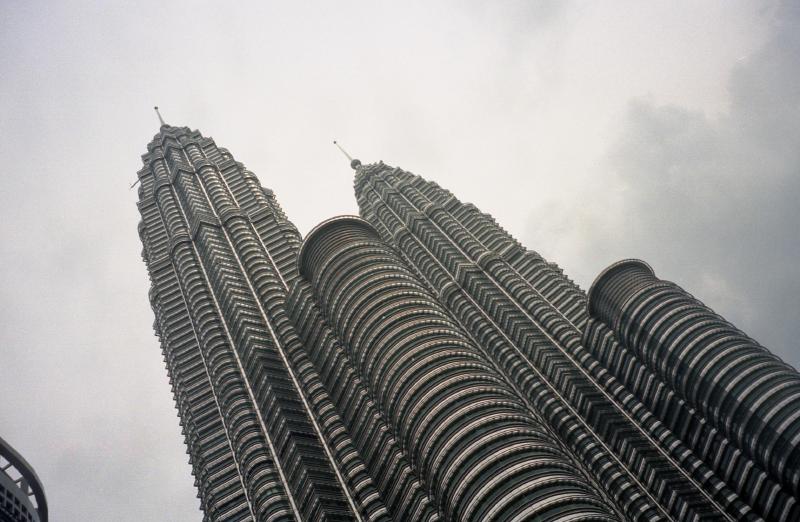 さて、満腹になったことだしまずは明日の時刻表を調べるために駅に行きますか。イポー行きの列車は午前中は7:35発の一本しかない。明日はこれに乗りましょう。では世界一の高さを誇るツインタワーのあるKLCCへと行きましょう。さっき見たKTMの駅に行くが・・・なんてことだ!よく見るとKLCCへ向かう方面はまだ工事中ではないか。ショックー!と言うことはバスで行かねばならない。バス停の近くまでは着いたがどこからどのバスに乗ればよいのかがさっぱりわからない。バスを待っている風の学生らしい兄ちゃんに場所を尋ねるとなんとバス停まで連れていってくれることになった。結局バスの人に尋ねてもらったりしながら5分ほどでめざすバスの所まで連れていってもらった。ありがとー。バスに乗ろうとすると車掌のオヤジがダミ声で「KLCC、KLCC〜」と呼び込みをしている。アメ横じゃあるまいし。バスの呼び込みなんて始めてみた。その辺に立っている人にもしきりに声をかけている。妙なものだ。街中は渋滞していてバスはなかなか進まない。が、少し離れると動き始めた。バスの中には大きな音で音楽がかかり、運ちゃんのマイバスといった感じ。KLCCのツインタワーは遠くを走っているときにはよく見えたのだが、近づくに連れて全く見えなくなった。と、突然目の前に大きくそびえ立つペトロナス・ツインタワーが見えたのでバスを降りた。・・・これはでかい。日韓が共同で建てたこのビルは実に452m、見上げると本当に首が痛くなる。このビルは主にオフィスビルだろうが、地下鉄が工事中の今は通勤が大変だろう。ビルの下に銀行があったので両替(\20,000→RM621.90)。さあ、ジュースでビタミン補給をしよう。3階にフードコートがあったのでそこで生パインジュースを飲んだ(RM2.30)。冷えていなかったがうまかった。1階にスーパーがあったので水とピラフの素を購入(RM8.00)。このスーパーの入り口にはドリアンがおいてあり、すごいニオイを放っていた。うーん、食べてみたいが・・・まあ今が旬のドリアン、この後食べる機会があるだろう。