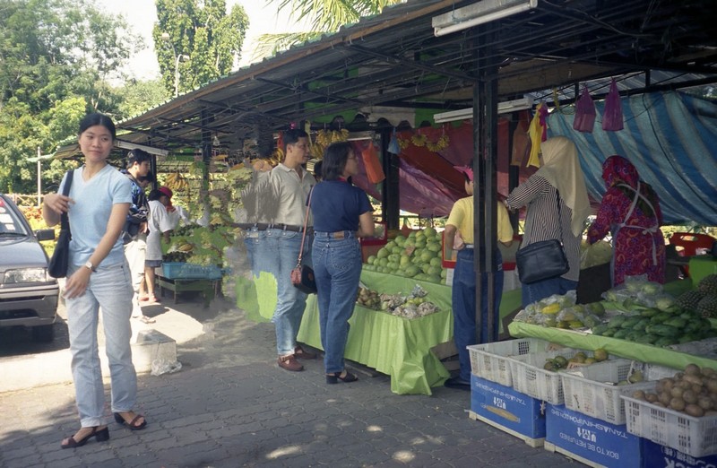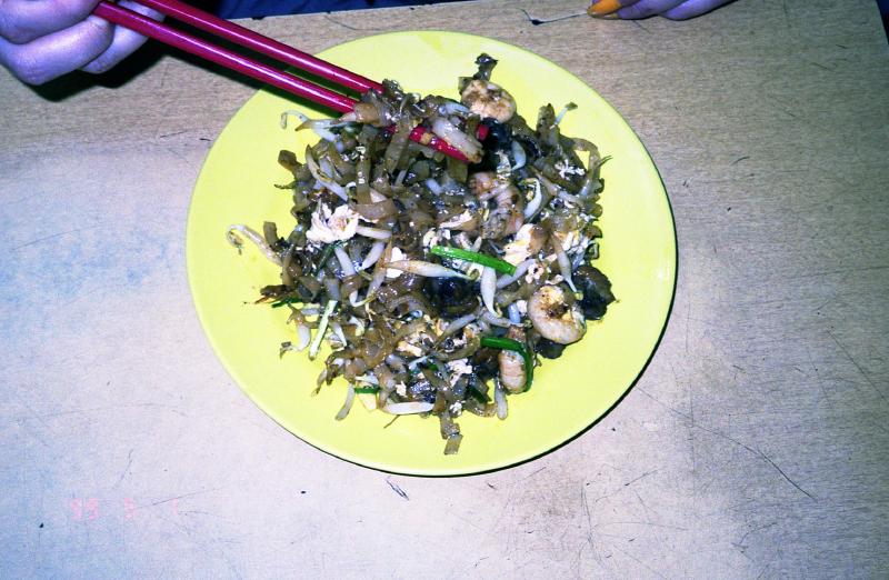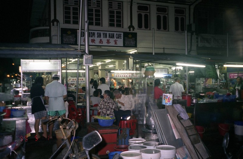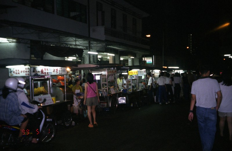ふー満腹。と、ガイドブックを忘れたことに気づき、ホテルに戻る。途中で水を買い(RM1.20)、部屋に戻ったら満腹のせいもありなんだか気持ちよくなってしまい、シェスタ・・・で目覚めたら19:00!あー気持ちよかった。再びコムターへ。いろいろとお店めぐりをしながらペナン島柄のTシャツや派手なスカートやタンクトップをゲット。安いし、ものも良さそうだ。さて、晩ごはんにいきましょう。ここジョージタウンには屋台街がたくさんあり、このコムター近くにもあるはず。少し奥の通りへ行ってみるが人通りがまるでなく、とても屋台などある雰囲気ではない。もう少し行ってみて何もなければ戻ろうとおもって十字路まで来ると、ん、向こうの方が明るいぞ、何だろう、おっ、屋台街だ!それほど規模は大きくないが一通りそろっているようだ。ようし、ここにしましょう。
