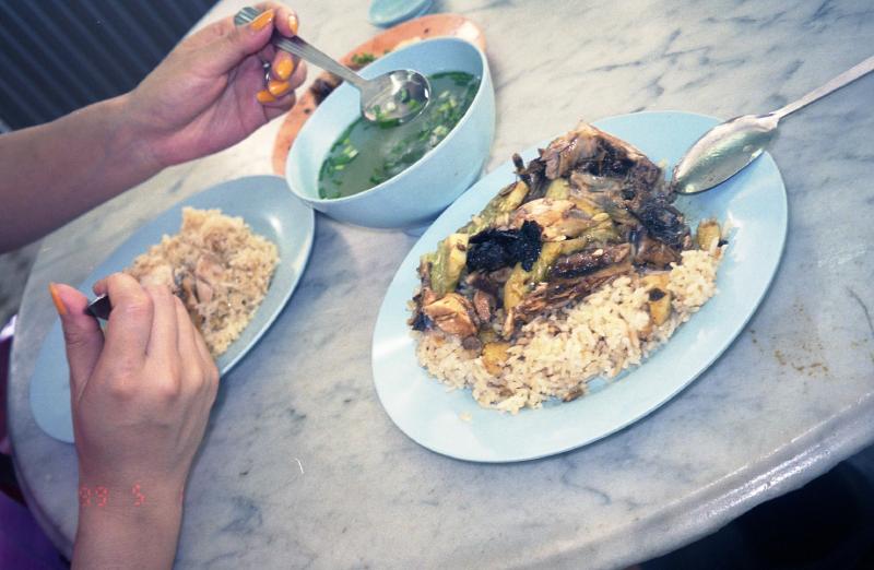 10分ほどの道のりだが、途中に屋台街がたくさんある。まだ昼過ぎなので活気はないが、夜にはきっと活気を帯びるのだろう。楽しみだ。コムターの中にはいろんなお店があるのだが、とにかくまずは腹が減った。本来はイポーでチキンライスを食べるはずだったので、コムター脇の道を探す。あった、「鶏飯」の文字が!よし入ろう。早速チキンライスを注文するとなんと売り切れ。ショックー。仕方がないのでマレー風の焼きそば(RM2.50)とラクサー(RM3.00)を注文。すぐにでてきたそれらをアッという間に平らげてしまった。うーんものたりない、やはりチキンライスが食べたい。店を出てしばらく歩くと再び「鶏飯」の文字が!しかも鶏が哀れな姿でガラスケースの中にぶら下がっているので、ここは間違いないだろう。店に入り、ローストとスチームの2種類注文(RM5×2)。スープもついていてなかなかの美味。どちらかとスチームの方が肉がとろける感じで好きかな。