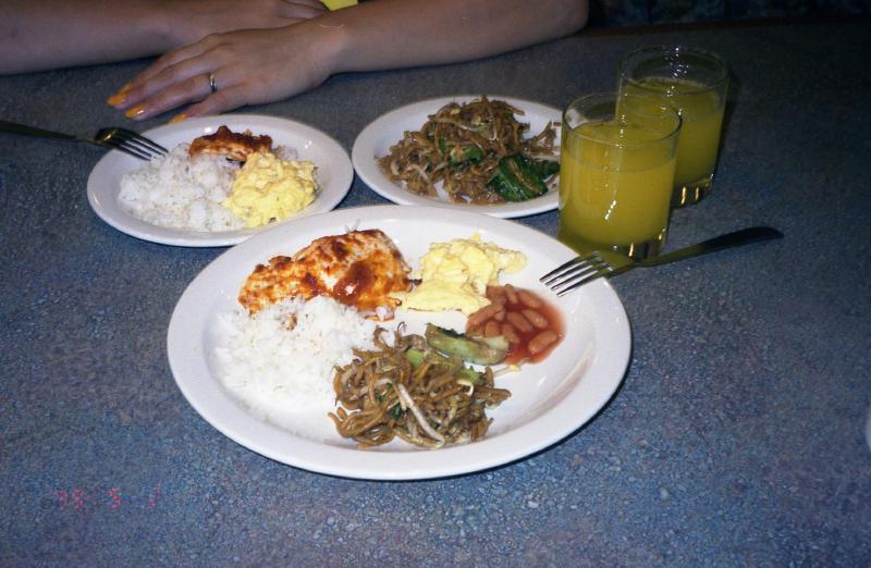 エアコンなどもちろんないので窓もドアも全開にして走る。約10分ほどでミッドランド・ショッピングセンター到着。わりと規模の大きいショッピングセンターだ。少し早いが、まず昼食にしましょう。最上階にフードコートがあり、魅力的なものがたくさんある。のどが渇いていたのでまずはジュースを注文。ライムジュースとマンゴジュース(各RM2.30)をたのみ、ほっと一息。そしてフードコートを一周し、土鍋で蒸したチキンライス(RM4)を注文。