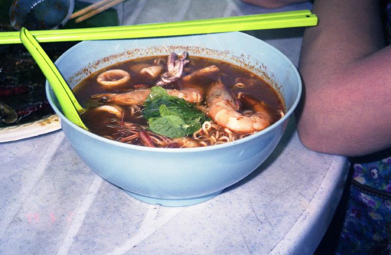 さてそれではごはんにしましょう。今日は昨日下見した屋台に行きましょう。ホテルの近くにあるその屋台は活気に満ちあふれていた。まずはビール(RM7.80)でのどを潤す。うまい!続いて鶏のサテー(RM4)、マテガイの辛子炒め(RM15)を注文。ちょうど同じタイミングで出てきた。うまいうまい、この辛みがうまい。サテーがあっという間に無くなったので豚のサテーを注文。そしてきしめんのような太さのビーフンのスープを注文(RM4)。食べる食べる、アッという間に平らげる。ビールのおかわりをし、シメにタイ風のシーフード麺を注文。これが辛くて酸っぱくて絶品(RM5)。あーくったくった。満腹です。ごきげんにホテルに帰り、明日が早いのでモーニングコールとタクシーを頼み、シャワーを浴びてとっとと寝ました。