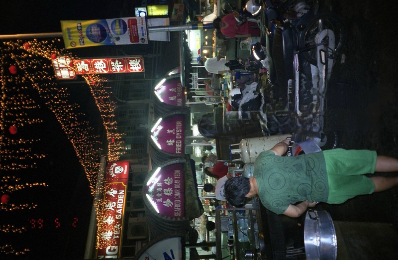 行きと同じく、エアコンのないオンボロバスは窓やドアを全開にして走る(RM1×2)。途中そこかしこに屋台街があった。かなり規模の大きいところもあり、そろそろにぎわい始めている。30分ほどでバスはコムターに到着。昨日とは違う方向で屋台街を探すが見あたらない。仕方がないのでまずはコムターで買い物をすませよう。ここは58階に展望台があり、そこでおみやげも売っているらしい。エレベーターを探すが見あたらない。かなり探し歩いて、ようやく「雲上閣」という矢印を見つけたので、展望台と思いそれに従って歩いていくと、なんだか管理人室の奥のトイレの奥の妙なところにエレベーターがあった。これはわかりづらい。いったいこのビルはいつ頃建ったのだろう。かなり古い感じはするが、このペナンに65階建てなどそんなに昔からあったとは思えないのだが・・・とにかく58階まで上がった。到着すると、展望台もかねているせいかおみやげ屋に入るのに一人RM5いるという。ううう、仕方がない払おう。中に入り、ざっと見渡してみたが大したものはなくしかも高い。展望台といっても明るい街ではないので夜景がきれいというわけでもない。失敗だ〜。退散しましょう。