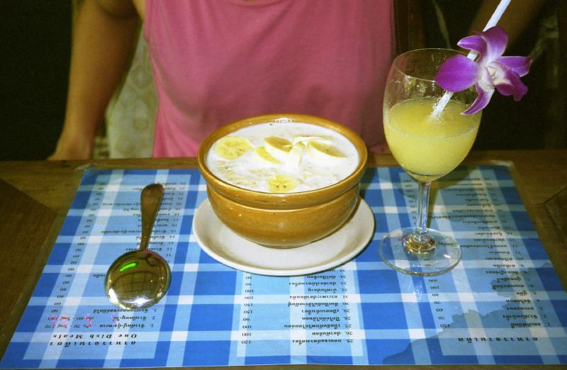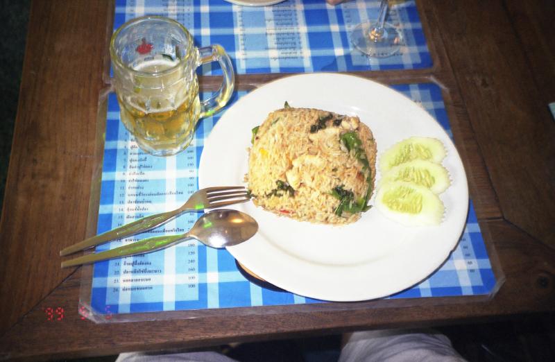 通りの中央にあるカオサンパレス(580B)にチェックイン。いかにも安宿と行った感じだ。まあ今日はここに泊まり、明日はシーロムの少しいいホテルにしよう。荷物をおいて近くのレストランへ。ビールとオレンジジュースで夜行疲れの身体をいやし、バナナのお粥とタイ風チキンカレーを注文。しばらくゆっくりした後ホテルに戻り、少し眠ることにした。昼過ぎに起き、部屋を出た。