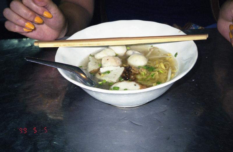 シルクのリップケースなど、ちょっとした物がいろいろとあるのでおもしろい。その後まずはロビンソンデパートまでの約1kmをぶらぶらと歩く。途中屋台街を見つけたのでお昼にすることにした。麺を頼んだが(20B)、この中に入っているさつま揚げのようなものがとても美味しかった。食後にビタミン補給のマンゴー(10B)を食べた。うまいね。シーロム通りにはすごく立派なホテルがあったり、そのすぐ横に古ぼけた食堂があったりとおもしろい。今ちょうど高架鉄道の建設中のようだ。次ここに来るときにはもっとスムーズに移動が出来るようになっているのだろう。