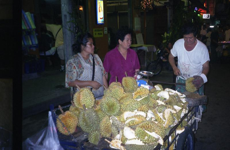 さて、何から食べましょうか。まずはタイ風焼きそば(10B)、春巻(25B)。できたて、揚げたてでとてもうまい。続いて串焼き(5B)、そして別の屋台で焼きそば(10B)。うまいうまい。デザートはバナナパンケーキ(10B)、そしてついにドリアン(10B)に挑戦!大きな果実の中の実を、一房ずつラップにくるんでくれる。黄色くねっとりとした果肉は強烈な匂いを放っている。意を決して食べてみると、独特の風味が口の中から鼻の奥までひろがる。初体験だけあって、まずくはないがそうたくさん食べられるものではないと感じた。でもタイの人はこの季節を心待ちにしているらしい。まあ日本にも臭い食べ物はいろいろあるので、慣れの問題でもあるのであろう。食後に今朝行ったレストランに行き、ピナコラーダとビール大ジョッキを注文(180B)。バンコクの夜はゆっくりと更けてゆく・・・
