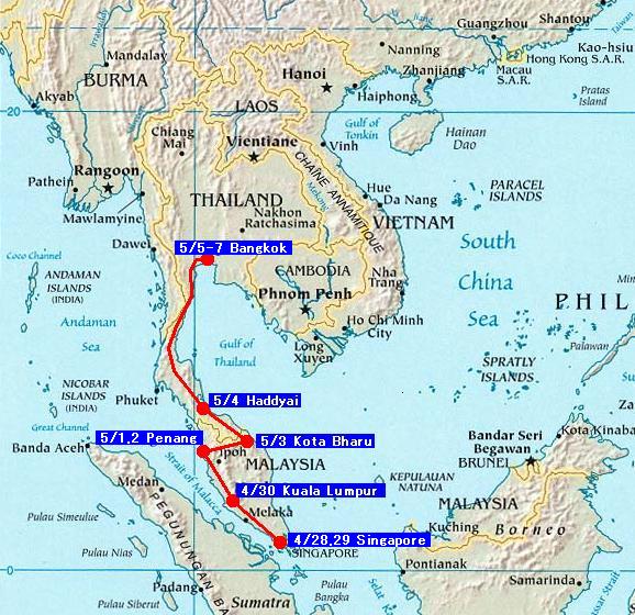 コタバルをたち、マレーシアとタイの国境を歩いて越える。ハジャイからは夜行バスでバンコクへ。 |