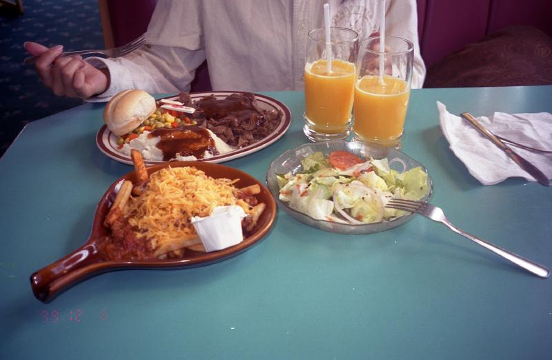 「いらっしゃいませ、デニーズへようこそ。何名様ですか。おたばこは吸われますか。」ではなく「Hello,two,smoking?」以上。わかりやすくていいが。さて、何にしようか。メニューを見ると、さすが本場は日本とはまったくメニューが違う。基本はハンバーガーとポテトと牛肉のものが多い。おそらくすごいボリュームのものが出てくると思うので、ローストビーフのプレートとメキシコ風味のポテトとサラダを1皿ずつにしておく。飲み物はオレンジジュース。さて、しばらくして出てきたものは・・・すごいボリュームだ。プレートを一人一皿はかなり多いだろう。味はまあまあいいのだが、全体的に濃い。でもすべて平らげました。おなかいっぱい。