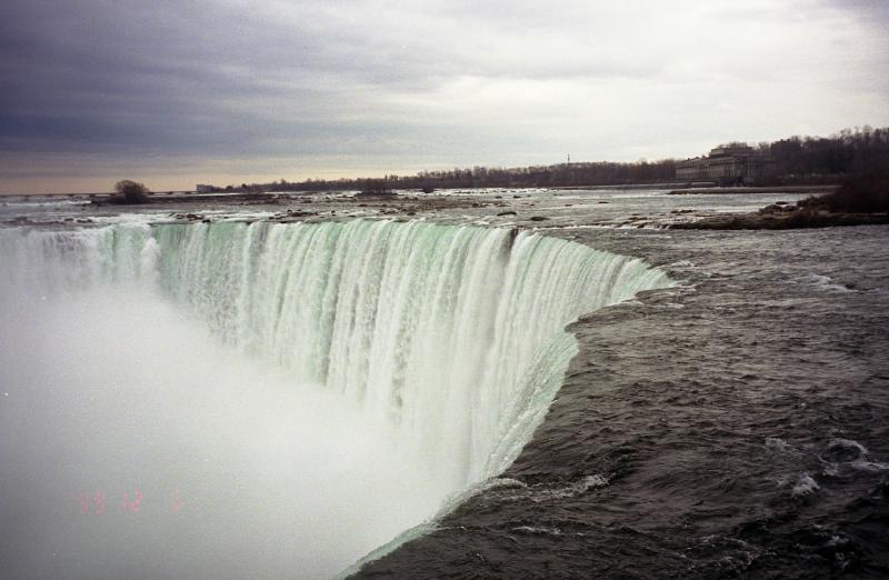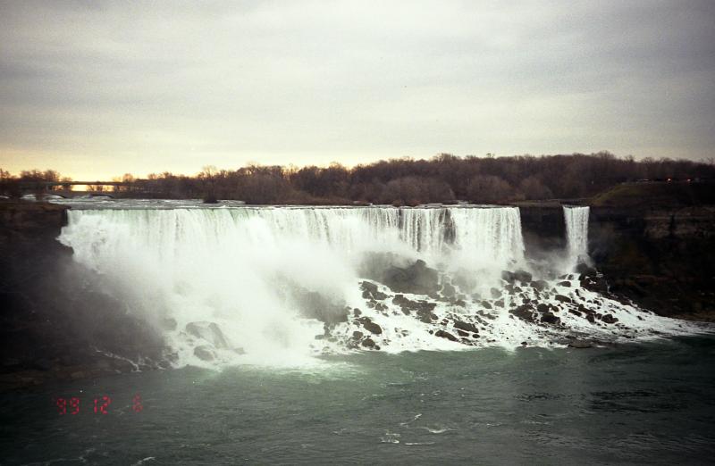 さて、滝へ向かおう。来た道を戻り、滝の近くまで来るがかなり大周りをしないと下に降りられない。結局15分くらい歩いただろうか、ようやくカナダ滝の近くまで来た。日本で見る滝とはまったく別のものだ。穏やかに流れている川が、突然豪音とともに数十メートル落下し、滝つぼへとたたきつけられ、もうもうとした水煙をあげる。まったく豪快だ。展望台にはたくさんの観光客がいる。日本人もちらほらといるようだ。いろいろな角度からのカナダ滝の眺めを楽しみつつ、アメリカ滝へと向かう。アメリカ滝もかなり大きいのであるが、カナダ滝と比べると半分くらいだろうか、ずいぶんと小さく感じる。しかも滝つぼが落ち込んでいるのではなく、岩場がなだらかに続いているので水煙があまりおきない。どちらも大きいのではあるが、カナダ滝に軍配があがる。