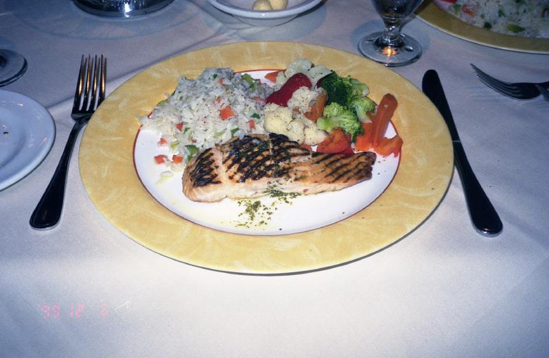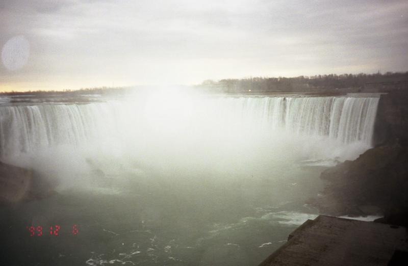 店のひとにタクシーを呼んでもらい、ホテルへと向かう。オンザレイクのほとんどの家は、クリスマスの飾り付けをしている。きれいだな。タクシーが郊外を走り始めたところで、もうだめ、寝てしまいました。ホテルに到着。眠い眠い、とにかく眠い。晩ごはんには少し早いので少し寝ようか、と思うまもなく眠りに落ちた。目がさめると9時過ぎ。3時間近く寝たことになる。でもおかげでずいぶんとすっきりした。部屋からナイアガラの滝を見る。夜はライトアップしているらしく、青い滝になっている。さあ、ごはんだ。ホテルの下の店に行くが、昼と変わらず閉まっているようだ。2階に行ってみるが、お客さんがいる気配が無い。もう終わりなのだろうか。どうしよう。隣のホテルに行ってみよう。マリオットホテルに入り、2階へ。どうやらやっているようだ。さあ、入りましょう。窓際の席に案内してくれる。さっき青かった滝は、ピンクになっている。滝を見下ろす席なんて、いいではないですか。シャルドネのハウスワイン、前菜にスモークサーモンと野菜スープ、メインはサーモンのステーキ。まずはワインで乾杯。味のはっきりとした、すっきりとしたワインだ。前菜が出てきた。スモークサーモンは日本で普段食べるものに比べて、脂が乗っていてねっとりとした味わいでとてもうまい。いっしょにでてきたパンも、ゴマが香ばしくておいしい。前菜を平らげ、しばらくするとメインが出てきた。サーモンステーキも、脂の乗ったサーモンを焼いているわけだから、うまくないはずが無い。つけあわせの野菜がまたうまい。トロントでも思ったが、野菜の味がしっかりしているのだ。おいしくいただきました。デザートはいらないが、もうしばらくゆっくりしたいのでコーヒー&紅茶を頼む。