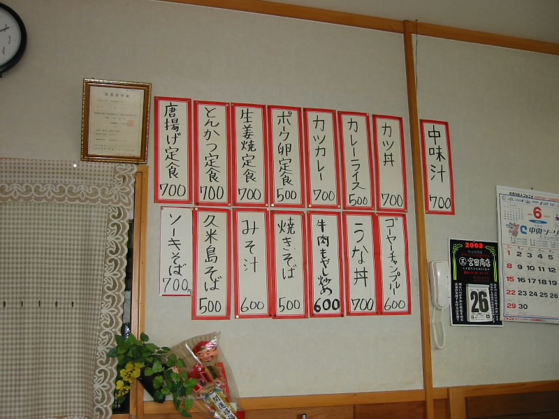 もうとっくにお昼の時間は過ぎていることもあり、おなかが減ったぞ。とにかく何か食べよう。ホテルを出ると、目の前に「久米島そば」ののぼりが見える。他のお店をゆっくり見るほどのパワーもないので、ここでいいか。喫茶オアシス、ちょっと怪しげだが。中に入り、適当に席に着く。少しお昼時は過ぎているのか他には誰も居ない。早速久米島そばを注文。出された水を飲んでみる。これが冷たくて、実にうまい。しばらくすると、現地の人らしいおじさんが入ってきた。そのおじさんは「この水うまいから飲んでみ」とグラスを差し出すので、飲んでみるとそれは泡盛。何でも久米仙という地酒らしい。さっきの水で割っているのか、スッキリとしていてとてもおいしい。そのおじさんが話しかけてきたのはいいのだが、7割は理解できない。なんとか雰囲気で、どこから来た、いつまでいる、俺は漁師だ、といったことは分かったのだが・・・ところが、それは序の口。しばらく後でそのおじさんの友達らしき人が入ってきて話を始めたのだが、これがもう9割9分9厘分からない。なんとか数字らしき言葉が分かる程度なのだ。地元の人同士の琉球言葉、沖縄は5度目だがここまでの洗礼は初体験だ。まったく、日本は広い。