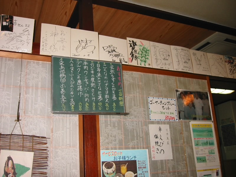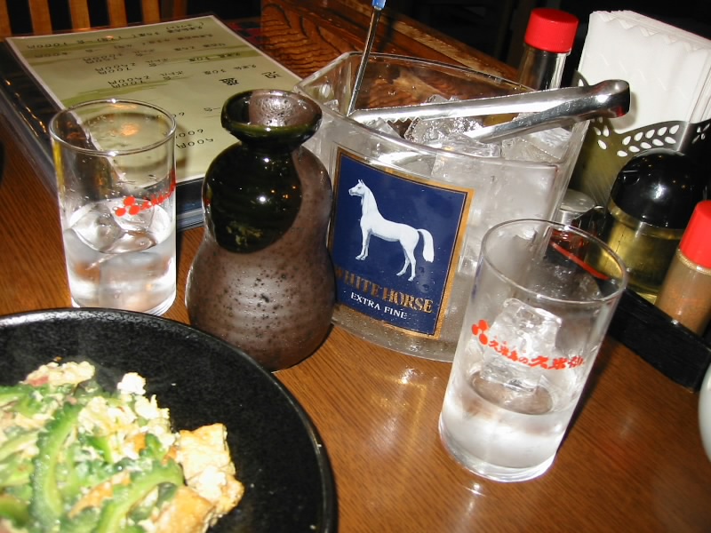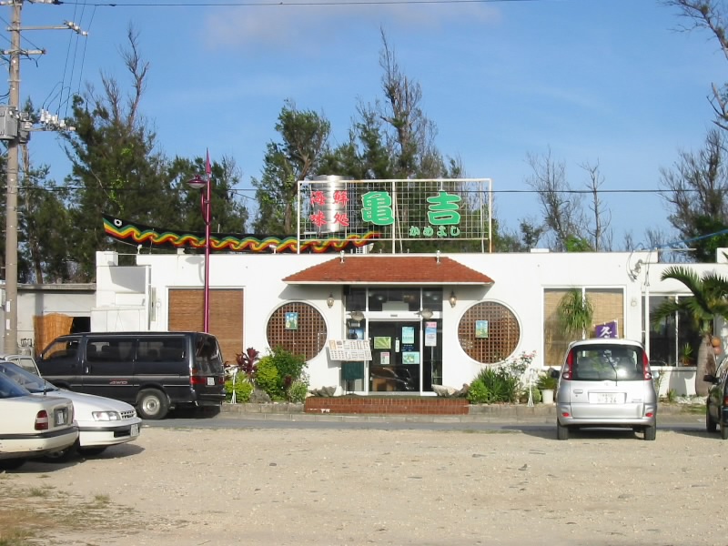 さて、晩ごはんだ。さっきの散歩で目をつけていたお店に行ってみる。まずは「亀吉」・・・満席。ならば「三芳」・・・満席。あれれ、それなら「木こり」・・・満席。どういうこと?7時を回ったころだが、どうしてどこも満席なのだ?とりあえず席の多い亀吉に入り、待つことにしよう。まあ前には一組居るだけなので、すぐ入れるだろう。それにしてもこれほどの混雑にはびっくり。暗くなったら他にすることがないこと、小さな子連れも多いこと、お店そのものが少ないこと、地元の人も来ていること。理由はこんなものだろうか?30分ほどして、ようやく席につくことができた。さて、何にしましょうか。まずはオリオンビールで乾杯だ。久々だ。もずくに島らっきょとともにいただく。沖縄のモズクは太くてしっかりしており、いかにも海草という感じでおいしい。島らっきょはしゃきしゃきした歯ごたえで、さっぱりしておいしい。しばらくすると牛肉のウンチェーバー炒めが登場。ウンチェーバーというのは青菜の一種で、要するに牛肉と青菜の炒め物。ビールの進む味だ。おいしいと思ったが、さーちゃんは肉がくさいとのことでお好みではない様子。うーん、確かに臭い牛肉も食べたことはあるが、今日の牛肉に関しては何も感じないのだが・・・続いて島豆腐の揚げ出しが登場。もう少ししっかりした豆腐を想像していたのだが、思ったよりもやわらかい。でもおいしいぞ。そしてゴーヤーチャンプル。やっぱりこれは欠かせないでしょう。さわやかな苦味のゴーヤーがうまい。ビールが進むね。途中、iモードで野球の途中経過をチェック。海外ではこれはできないが、久米島でも立派に使える。阪神は今日も勝っているし、巨人は今日も負けている。いったい今年はどうなっているんだろう。ビールがなくなってしまったので、次は泡盛。久米仙を2合、ロック&水割りで楽しむ。古酒ではないのを頼んだので、すっきりとした味わいだ。もずくと島らっきょを肴に、泡盛をちびちびと。いいねえ。時間はあっという間に経ち、お店もだいぶすいてきた。もう一度iモードチェックをすると、阪神は広島に逆転負け、残念。結局巨人も負けのようだ。さて、そろそろしめますか。最後にもずく雑炊を頼む。当然のことながら、うまい。おなかいっぱいだ。
