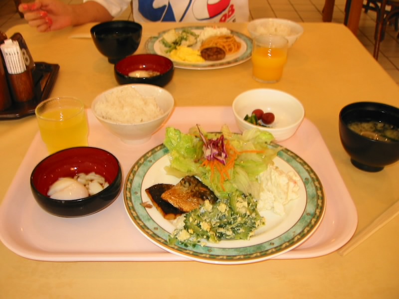 7時ごろ起床。気持ちのいい目覚めだ。外を見ると。少し雲は多いがきれいな青空が広がっている。今日も暑くなるんだろうな。さて、朝ごはんへと向かおう。一階のレストランでのバイキング形式だ。沖縄らしく、ゴーヤーチャンプルなどもある。パンやベーコンもあるが、それよりもしっかりとごはんを食べておきたい気分。今日ははての浜に行くのでパワーをつけておかないとね。温泉卵もなかなかいい。いろいろたべて満腹になり、一旦部屋に戻る。水着に着替え、いざ出発だ。