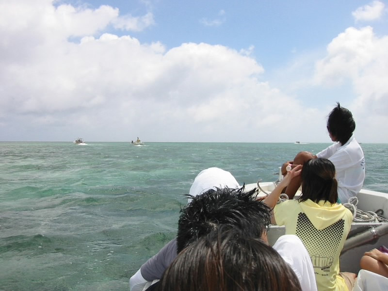 「はての浜」久米島の沖合い6キロに広がる、白い砂浜だけの無人島。ここに行くには、現地のツアーに参加するのが簡単だ。ホテルの集合場所に行くと、たくさんの人が出発を待っていた。ここからマイクロバスに分乗し、10分ほどで泊港へ。さらにボートに分乗し、いざはての浜へ向けて出発だ。港を出ると青い海が広がっている。小さなボートなので海が手の届くところにあり、とてもきれいだ。ボートは次第に速度を上げていく。最初は少し波しぶきがかかる程度。ところがしばらくしてボートのスピードが上がってくると、まともに波を浴びるようになってくる。USJのジョーズなど全く比べ物にならない。最後には波を頭から浴びるほどで、船頭さんがわざとやっているのかと思うほど全身に水をかぶるのだ。確かにぬれるから水着で行ってくださいとは言われていたが、まさかこれほどとは・・・カメラとかバッグとか、たまたま大きめのビニール袋を持っていたからぬれずにすんだが、持ってなかったら大変なことになるところだった。激しい航海は10分ほど続いただろうか、ようやく目的地が見えてきた。ここからはゆっくりゆっくりと浜に近づいていく。手を伸ばせば底に手が届きそうなほどの遠浅なので、モーターが藻に絡まないように、底に当たらないようにゆっくりとルートを定めているのだろうか。とてもこれでは大きな船は入ることができないのだろう。ボートはようやく波打ち際まで来た。ここで砂浜に降りるのだが、波打ち際なので当然足元はぬれる。はての浜、この自然を味わうには小さなボートでずぶぬれになるのもやむ終えないということか。但し大きめのビニール袋は忘れずに。