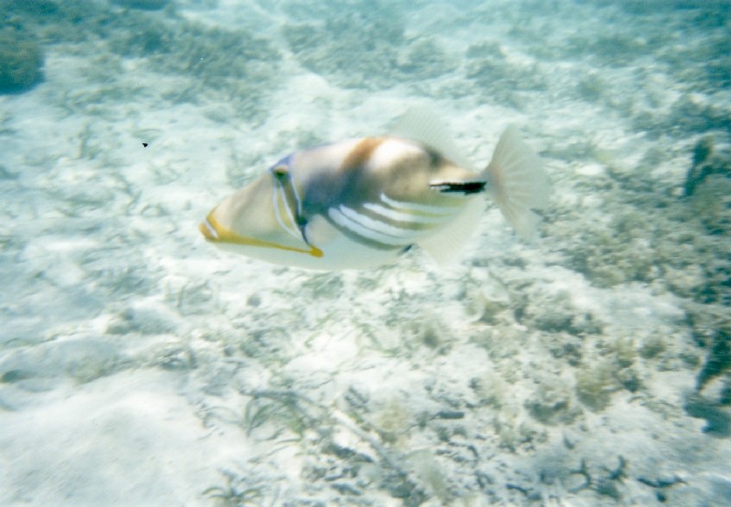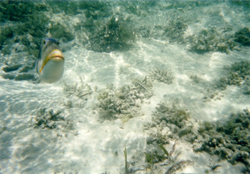 さて、シュノーケリングをしよう。ゴーグル、フィン、シュノーケル3点セットのレンタルはツアーに含まれているのだが、度つきじゃないと見えないのでマイ3点セットを持参。久しぶりのシュノーケリングだ。さあて、何がいるかな・・・いきなり発見、ムラサメモンガラ。あとはミツボシキュウセンなど、結構大きな魚もいるな。名前もわからない小魚もたくさん群れている。それにしてもとにかく遠浅。沖へ行っても深くならず、逆に浅くなっておなかがつきそうなところもあるくらいだ。しかもほとんどが砂浜なので、それほど魚の種類が多いわけではないし、サンゴがたくさんあるわけでもない。比べるとかつて訪ねた阿嘉島の西ノ浜ビーチや渡嘉敷島の阿波連ビーチの方が面白いだろう。でも天気もいいし、海もきれいだし、とても気持ちがいい。これもまた楽しいものだ。しばらく泳いでいると、突然「ゴツン」とした音がした。ん?なにかがフィンにあたっているようだ。態勢を変えてみてみると、なんとムラサメモンガラ(以下ヤツ)がこっちに向かってくるのではないか。とっさに手を出すと、カメラでヤツをどついてしまった。ところがヤツはひるむでもなく、体を震わせ、まさに威嚇するように近づいては離れ、近づいては離れを繰り返す。なんだ?でもいくら威嚇されても、正面から見る魚って緊張感がないのよね・・・後で分かったのだが、ヤツらは縄張り意識が強く、特に春から夏にかけての産卵時期には非常に攻撃的になるとのこと。しかしそれにしてもこんな人の多いビーチに縄張り作らなくても・・・というのは人間の勝手な都合か。ごめんね。