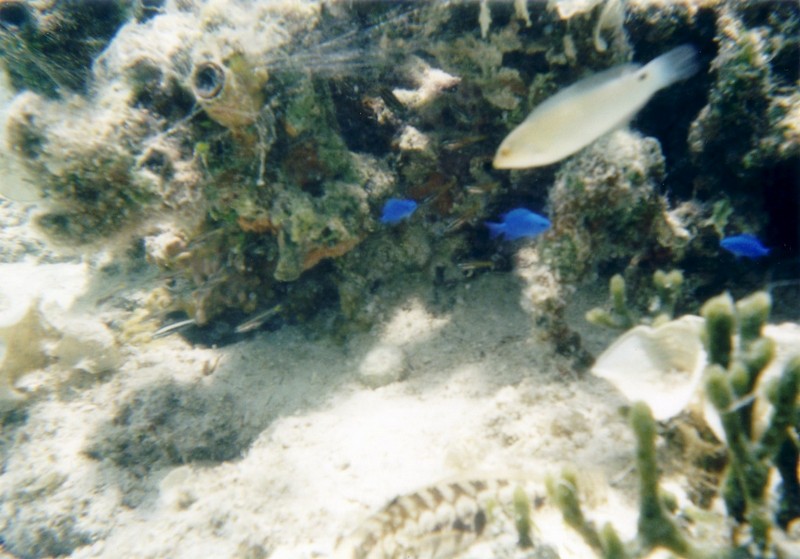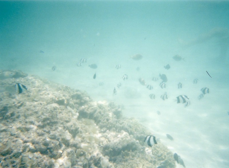 TULIPとかいうブランドのハムを、沖縄の人は好んで食べるらしい。アメリカの影響か?特別おいしいものとも思えないのだが、おにぎりにして食べることもよくあるとのこと。うーん、これはまあまあかな。でも全体的にはおいしいお弁当でした。食後しばらくのんびりし、再びシュノーケリング。少し違う方向へと泳いで見ると、大きな岩があり、そこにはたくさんの魚が群れていた。青いきれいな小魚もいるし、黒い縞の魚もいる。ウニもいるぞ。そして岩の裂け目をよく見てみると、中にはウツボがいた。いろいろといるんだね。さすが沖縄の海、楽しいです。