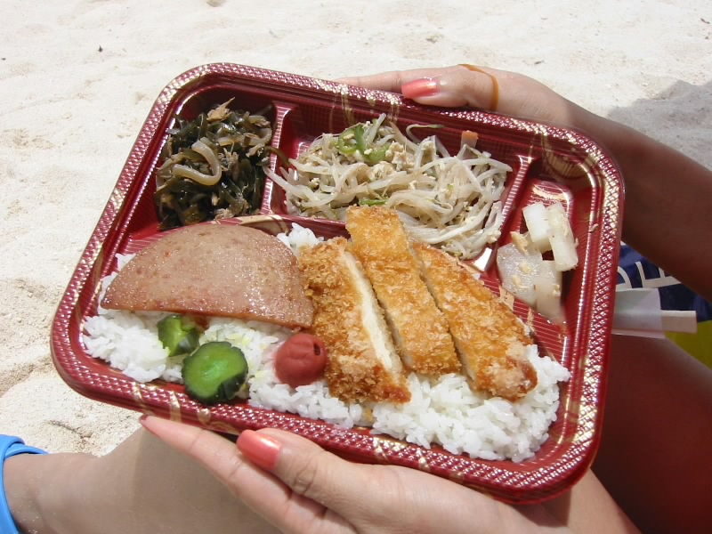 お昼ごはんタイム。これはツアーに含まれている。というよりも、他に何も売ってないので含まれていないと大変だ。海草を使った沖縄らしいおかずが入っている。あとは缶詰のハム。