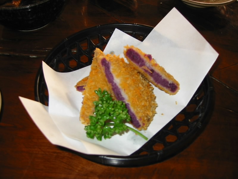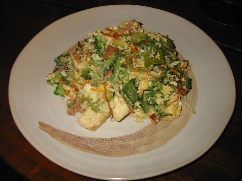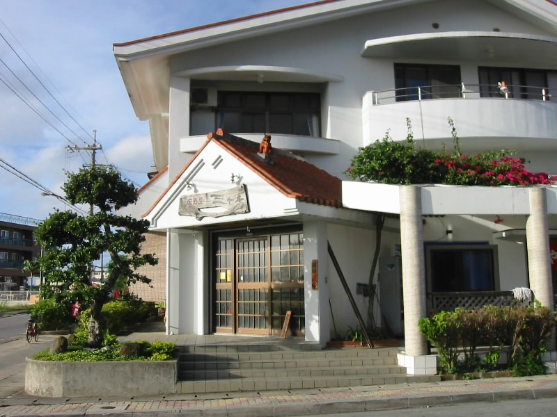 今日のお店は「三芳」。6時開店で、さすがに6時過ぎならば一番乗りだ。大きなテーブルの一番奥に座る。さあて、今日もゆっくりいろいろと食べるぞ〜。でもとにかくまずはビールで乾杯だ。強烈な日差しの中、熱くほてったカラダにしみわたる。うーん極楽。まずはやっぱりもずく。ん、ちょっと違う風味がするぞ?実はにんにく醤油風味。どうやら久米島では一般的な食べ方らしい。そういえば昨日のお店のメニューにもあった気がする。ほんのりとしたにんにくの風味が、柔らかくもずくのをくるんでいるような感じだ。実にうまい。続いてラフテー。要するに豚の角煮なのであるが、濃い目の味付けなのにさっぱりとしていて、いいねえ。そして紅芋コロッケ。かぼちゃコロッケよりももっと甘く、お菓子のようにも思える。揚げたてなのでサクサクだし、おいしいよ。そしてゴーヤーチャンプル。当然うまい。この苦味がビールにあうのだ。この4種類のおかずでひとしきり楽しむ。お店は次第に込み合ってきたぞ。ちょうど7時を過ぎた頃、満席となった。昨日とほぼ同じ時間だ。やはり子連れも多いし、地元の人も多いようだ。