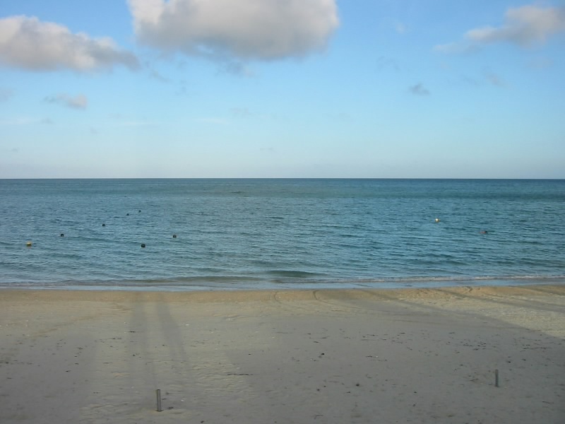 そういえば、まだウェルカムドリンクを飲んでいない。ホテルのカフェでカクテルを飲めるのだが、閉まるのが早いのでどうもタイミングが合わなかったのだ。今日は夕食までに少し時間があるので、飲んでしまいましょう。夕日が差し込むカフェで、グリーンフラッシュというきれいなカクテルを飲む。いい気分だ。さて、ぼちぼちごはんに行きますか。その前に、まずビーチへと行ってみる。すると潮はすっかり満ちており、さっきとはまったく様子が違っている。これならば泳げるが、もう遊泳時間は終了。砂浜に出てみよう。穏やかな波が打ち寄せており、海からの風がここちよい。とてもいい気持ちだ。いつまでものんびりしていたい、そんなビーチだな。