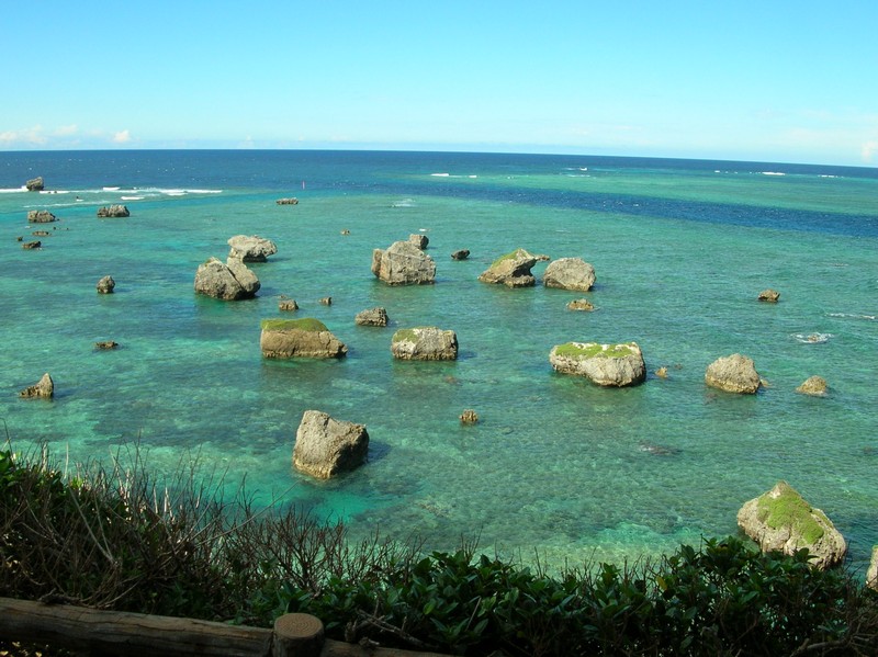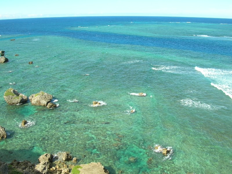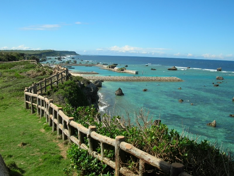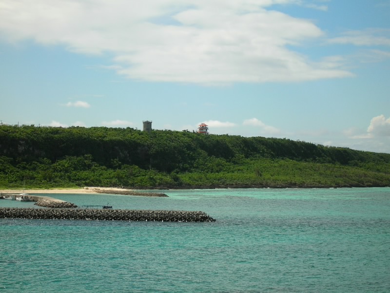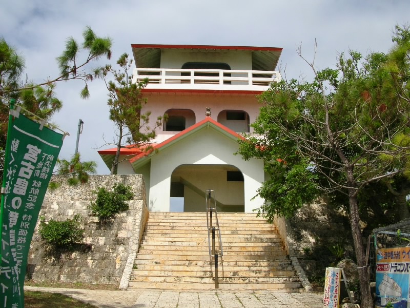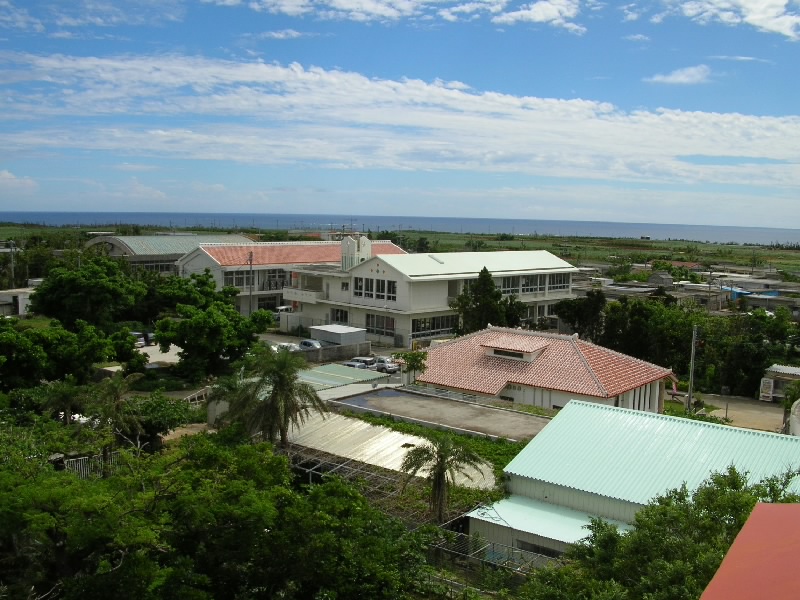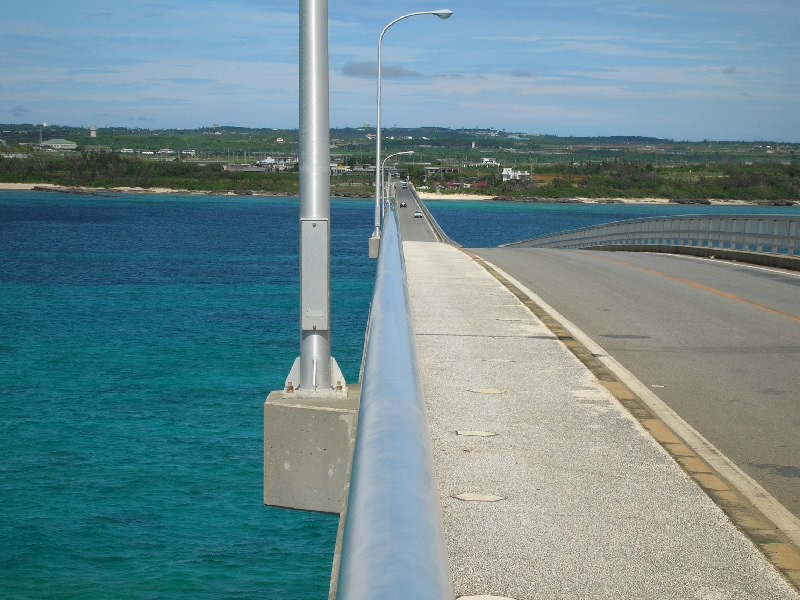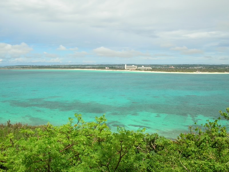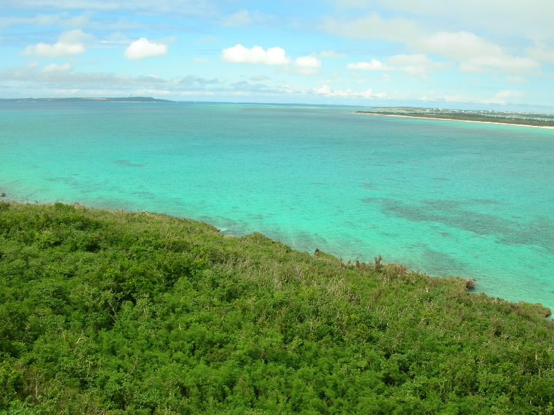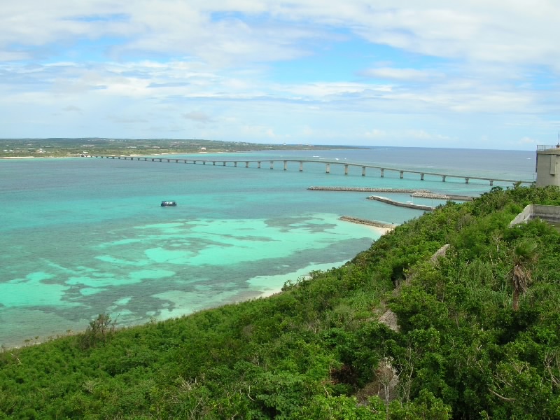 車でホテルをでて、まずはホテルからも見える来間島へ。サトウキビ畑を抜けると橋に到着。青い海の中、真っ直ぐ伸びる道が爽快だ。島に入り、少し走ると竜宮城展望台に到着。沖縄風の建物の階段を上がると、そこからは宮古島を一面に見渡すことができる。ちょうど正面に見えるのが、さっきまでいた東急リゾート。左を見ると、昨日フェリーで渡った伊良部島。右を見ると、ついさっき渡ってきた来間大橋だ。穏やかな天気の中、エメラルドグリーンの海がとてもきれいで気持ちがいいな。島の内側を見てみると、学校らしき建物があった。生徒はどのくらいいるのかな。